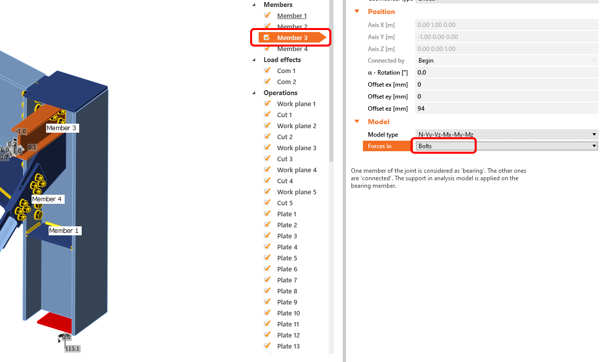 The properties of the Member 3 must be changed due to the fact, that Member 3 is connected with the shear connection. Move the Forces in to the Bolts.