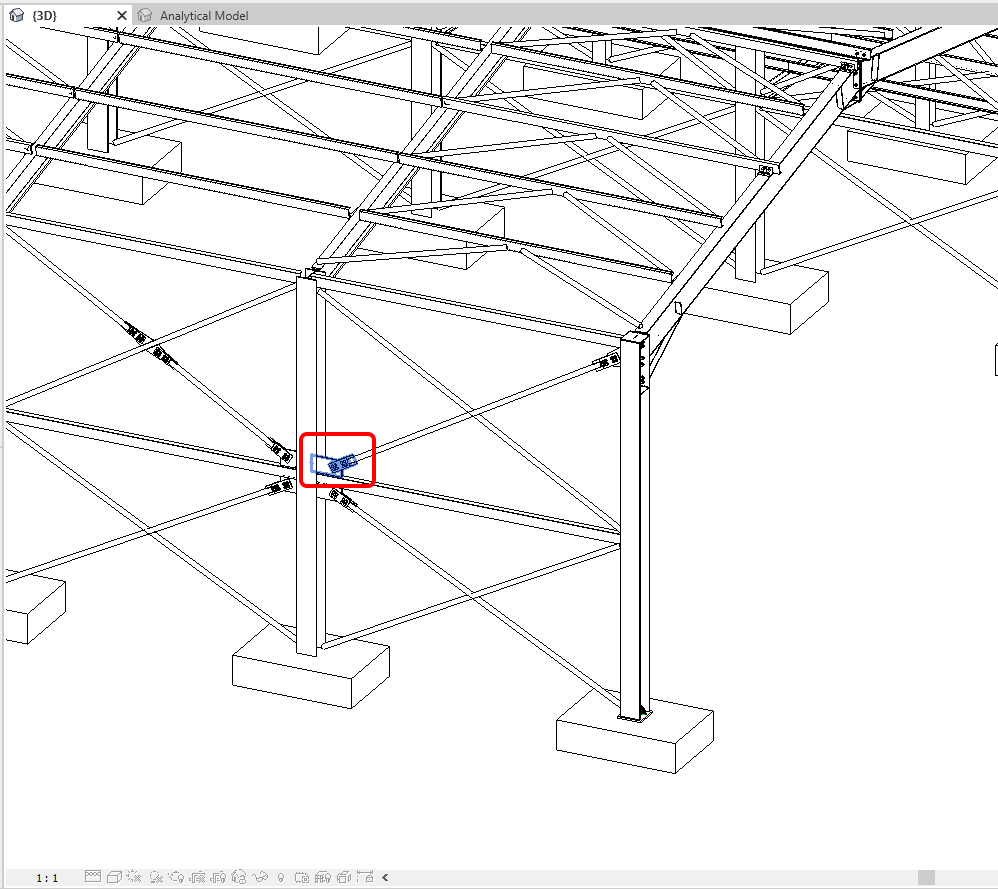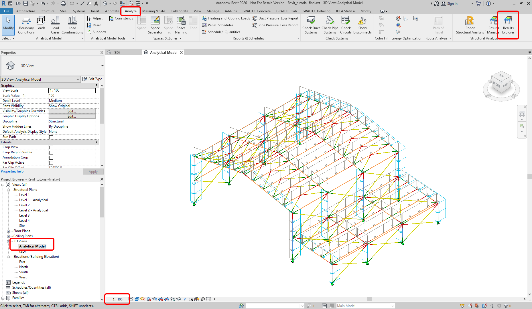 Double click on the Analytical Model view in the Project Browser tab. By this, the analytical model is shown. Also, the changing scale of the visualized items to 1:100 is handy. Choosing Results Explorer command in the Analyze tab is the next step.