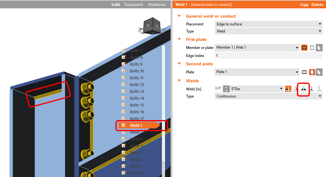 One weld definition must be changed. Let's rotate the model in a way that the weld under the column cap can be seen and click on it with the left mouse button. The right manufacturing operation will be chosen and it's properties shown in the right part of the window. Choose the double fillet weld.