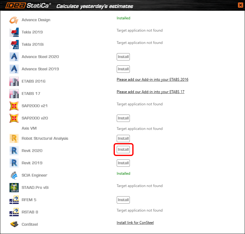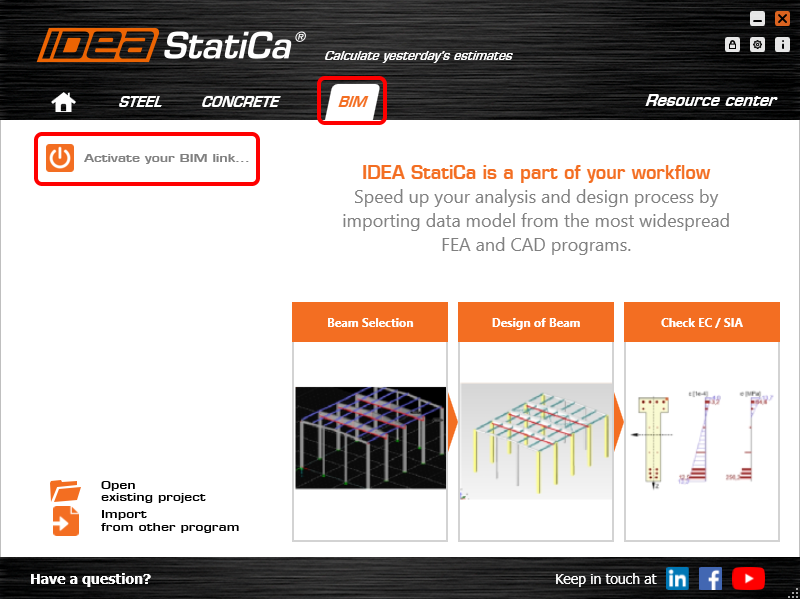 After installation of both programs, run IDEA StatiCa and start with the item BIM.