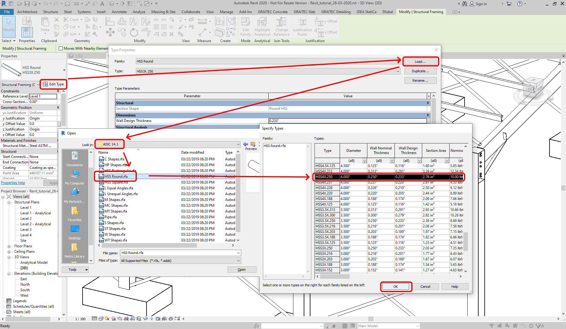 For the sake of the example, change it to HSS4X.250. Don't forget to load the right cross-section from the Revit families.