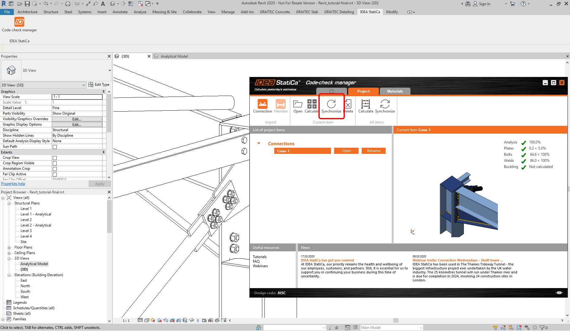 Let's take and advantage of the commands in the Code-check manager to update the model. If more changes in the project are needed and more exported joints are affected, you can use Synchronize (All items) command. This will save your time and update the connection data in one push.