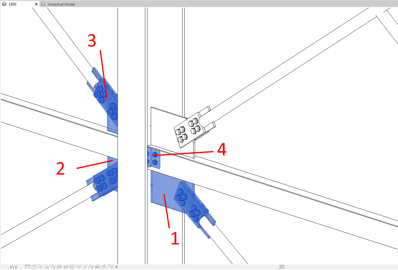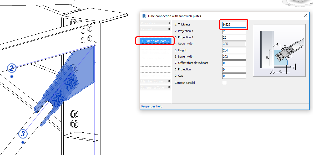Let’s say we need to do changes in the Revit connection model. For example, the thickness of the gusset plate for the bracing member. Double click by the left mouse button on the connection entity to open the properties dialog.