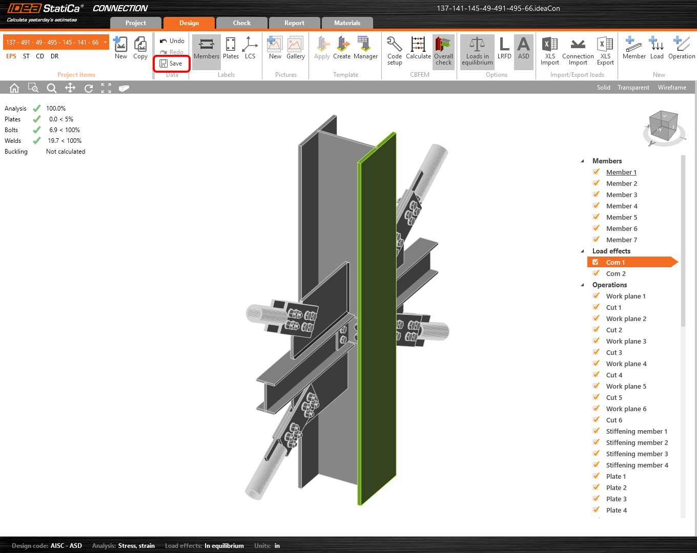 You can calculate the analysis right in the Design tab by the Calculate command. After the performed analysis let's change the tab to Check and set the Equivalent stress, Mesh, and Deformed model view. The results can be explored easily. If you are satisfied with the connection design now the data should be Saved. Now let's close the project window.