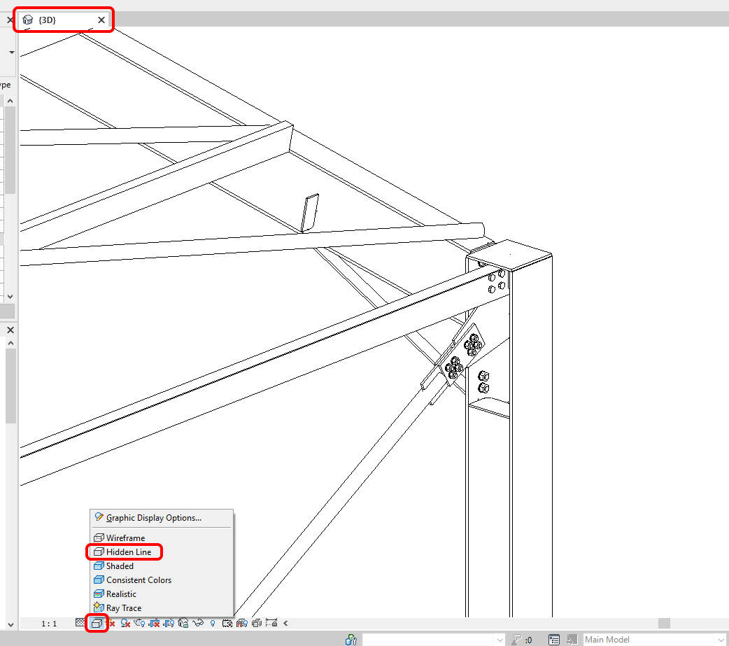 Let's get back to the 3D model view and the left frame joint from the first frame must be found. For better visualization, the Hidden Line model view is recommended.