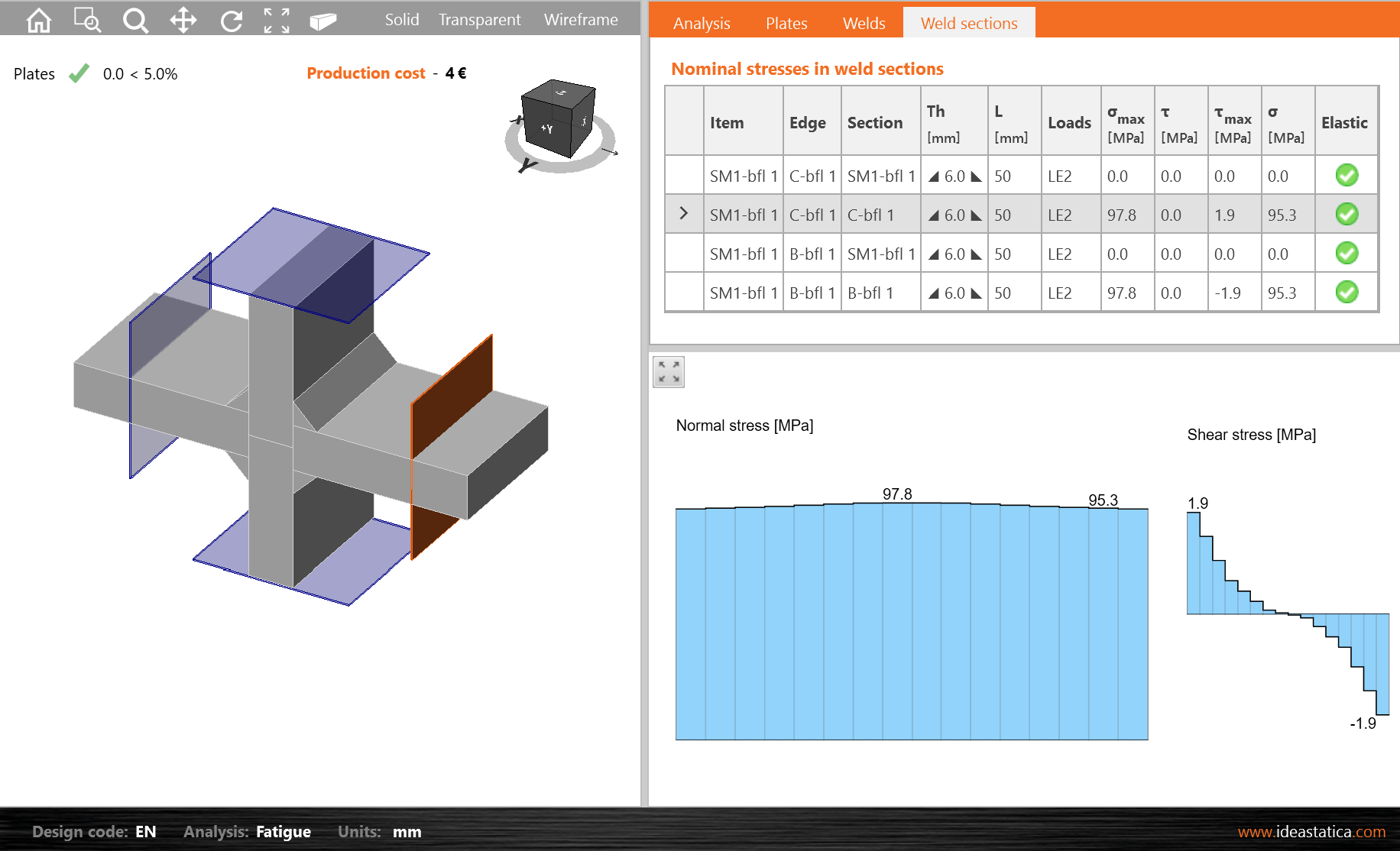 The cross-sectional area of the plate, for this analytical calculation, is A = 320 mm2. Fatigue sections are created using a working plane at a 40 mm distance from the weld toe to avoid the influence of peak stress from local weld geometry. The results of the analytical model AM, solid model FEM and shell model CBFEM are given in Tab. 5.