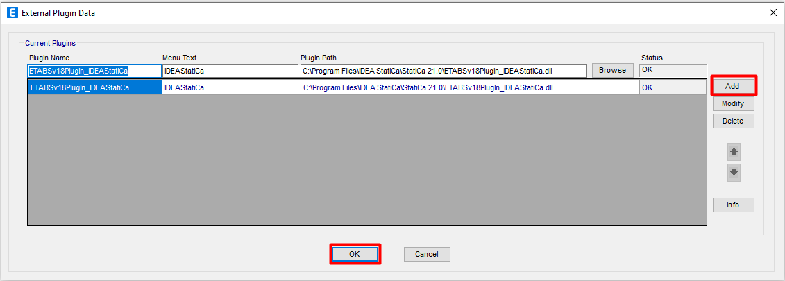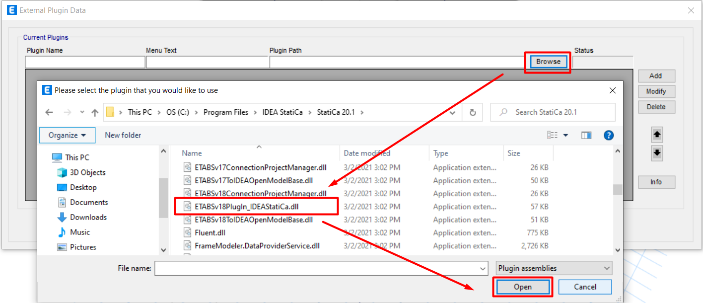 Klik daarna op Browse en laad het bestand dat hier is opgeslagen: C:\ProgrammabestandenStatiCa.*ETABSv18PlugIn_IDEAStatiCa.dll.