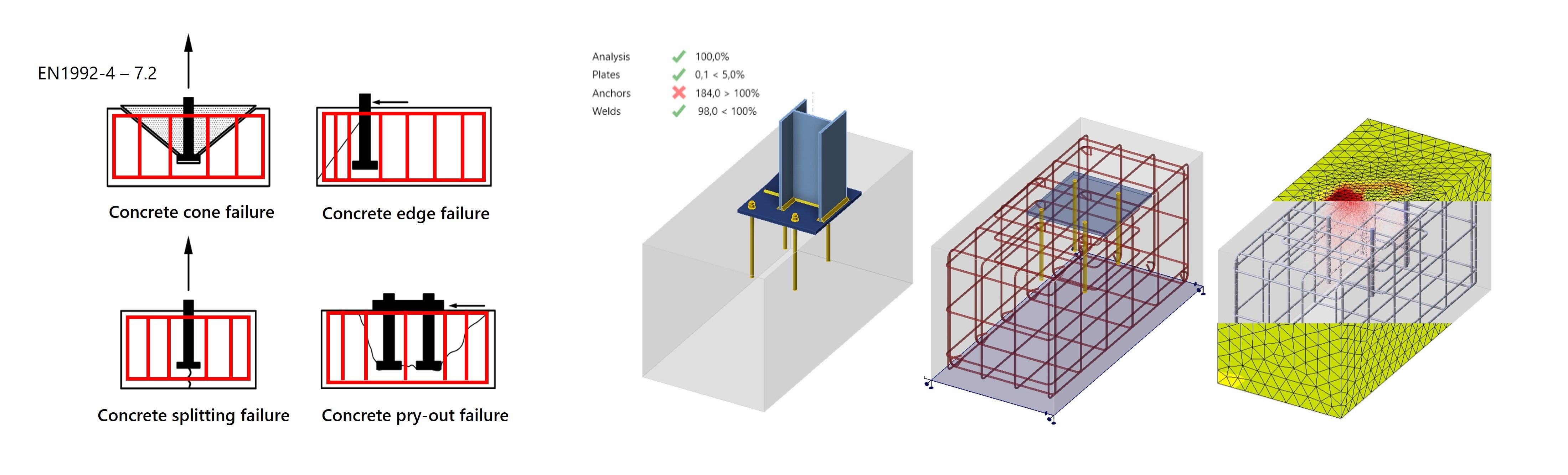 In de Connection applicatie kunnen we staalverbindingen modelleren met ankers en beton. Hierbij wordt het beton echter als ongewapend gemodelleerd en worden de toetsingen uitgevoerd volgens EN 1992-4, artikel 7.2.