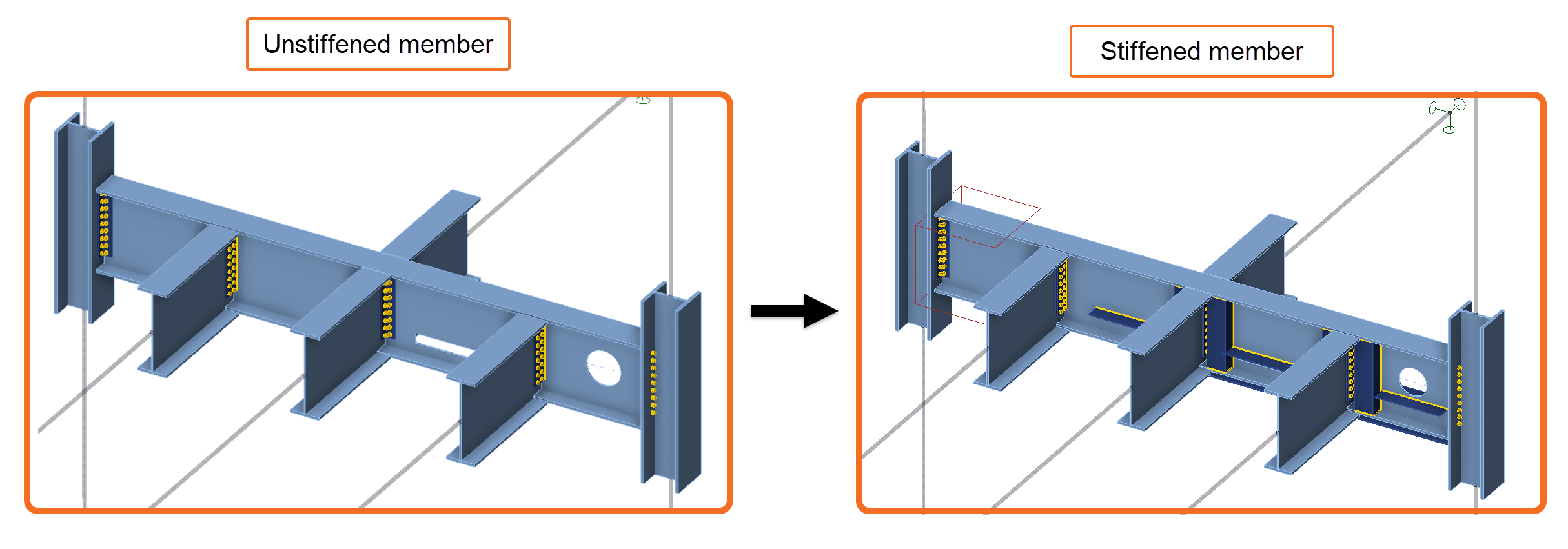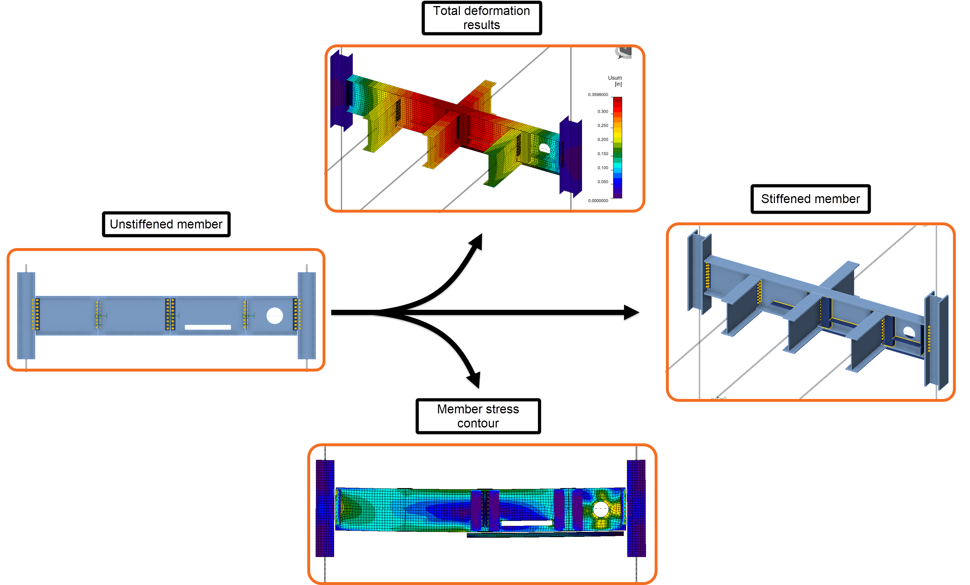 To address this, the engineering team leveraged the IDEA StatiCa Member application to perform a detailed stress analysis of the floor beams, particularly at critical web openings. By accurately modeling the existing beam conditions and proposed reinforcements, the software provided insight into stress concentrations and load redistribution, allowing the team to develop efficient and reliable reinforcement details.