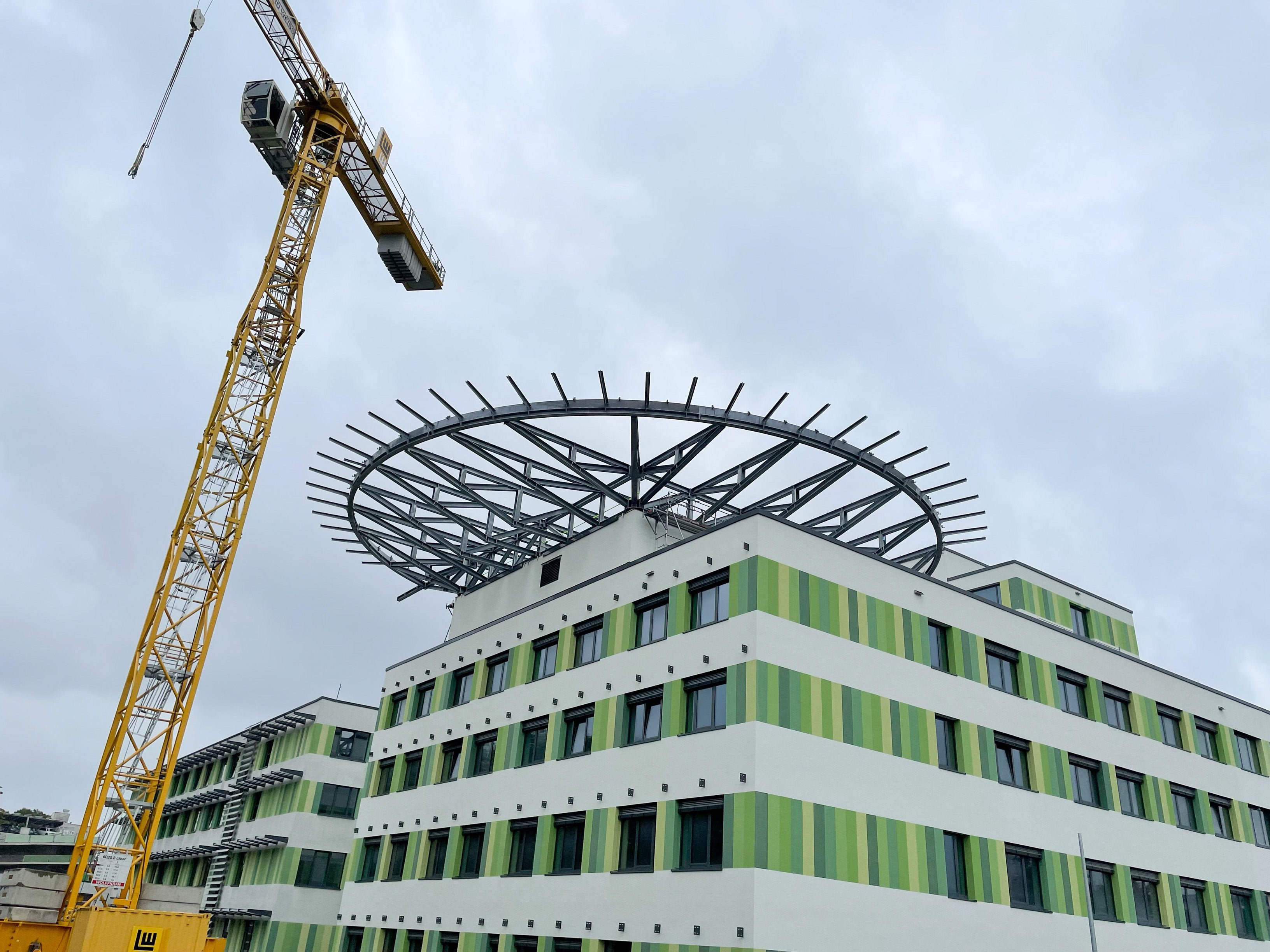 The project is part of the extension of Klinikum Crailsheim (Crailsheim Hospital). On level 5 of the East Extension, a helicopter landing pad is installed on the flat roof of the hospital. The landing platform is 30 metres in diameter and consists of a reinforced concrete deck supported by a steel substructure. The steel structure is made of several truss girders in two perpendicular directions. The landing platform cantilevers up to approximately 9 m beyond the edge of the building.
