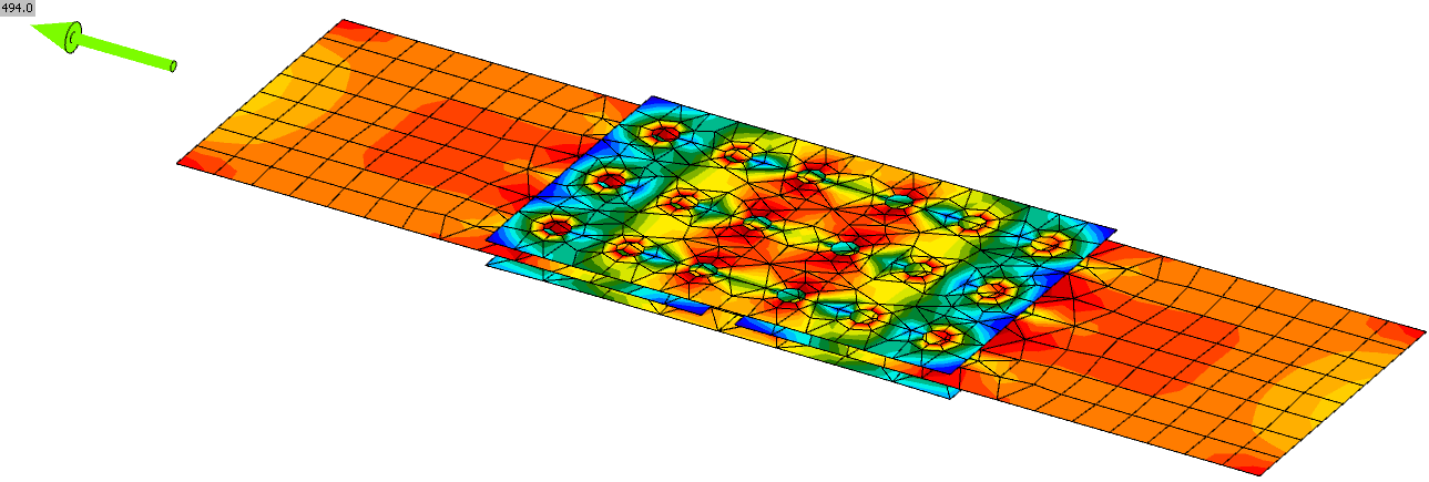 The tensile forces in bolts are neglected in manual calculation but they do not affect the shear strength of bolts by much. The load resistance in IDEA StatiCa Connection is 494 kN while in manual calculation, it is 496 kN. In IDEA StatiCa Connection, bolts are decisive and the plates are yielding. In manual calculation, the bolts and plate tensile rupture have the same load resistance. The difference between results provided by software and manual calculation is only 0.4 %.