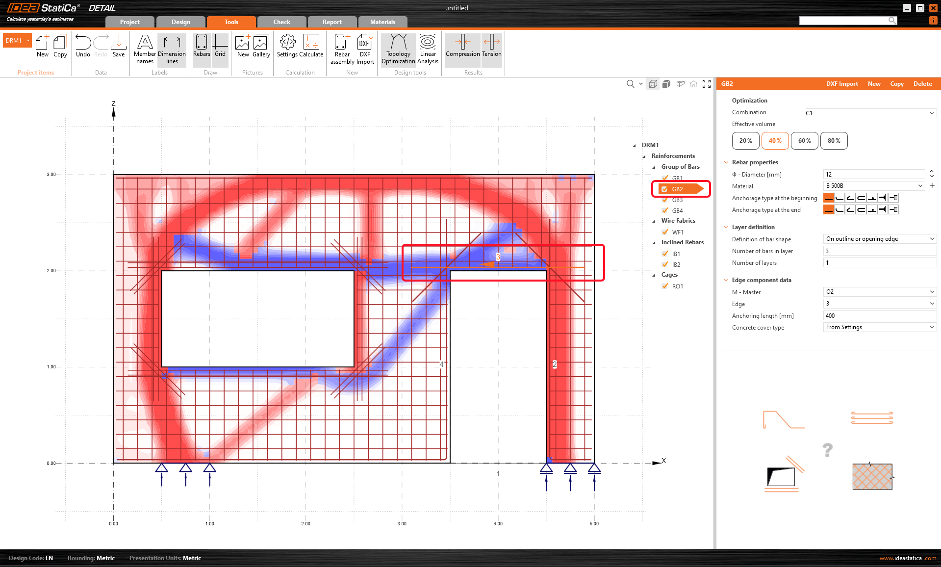 Selecteer de groep staven GB2 en wijzig de diameter en verankeringslengte. De kleine oranje pijl in de scène geeft de richting van de staven aan.