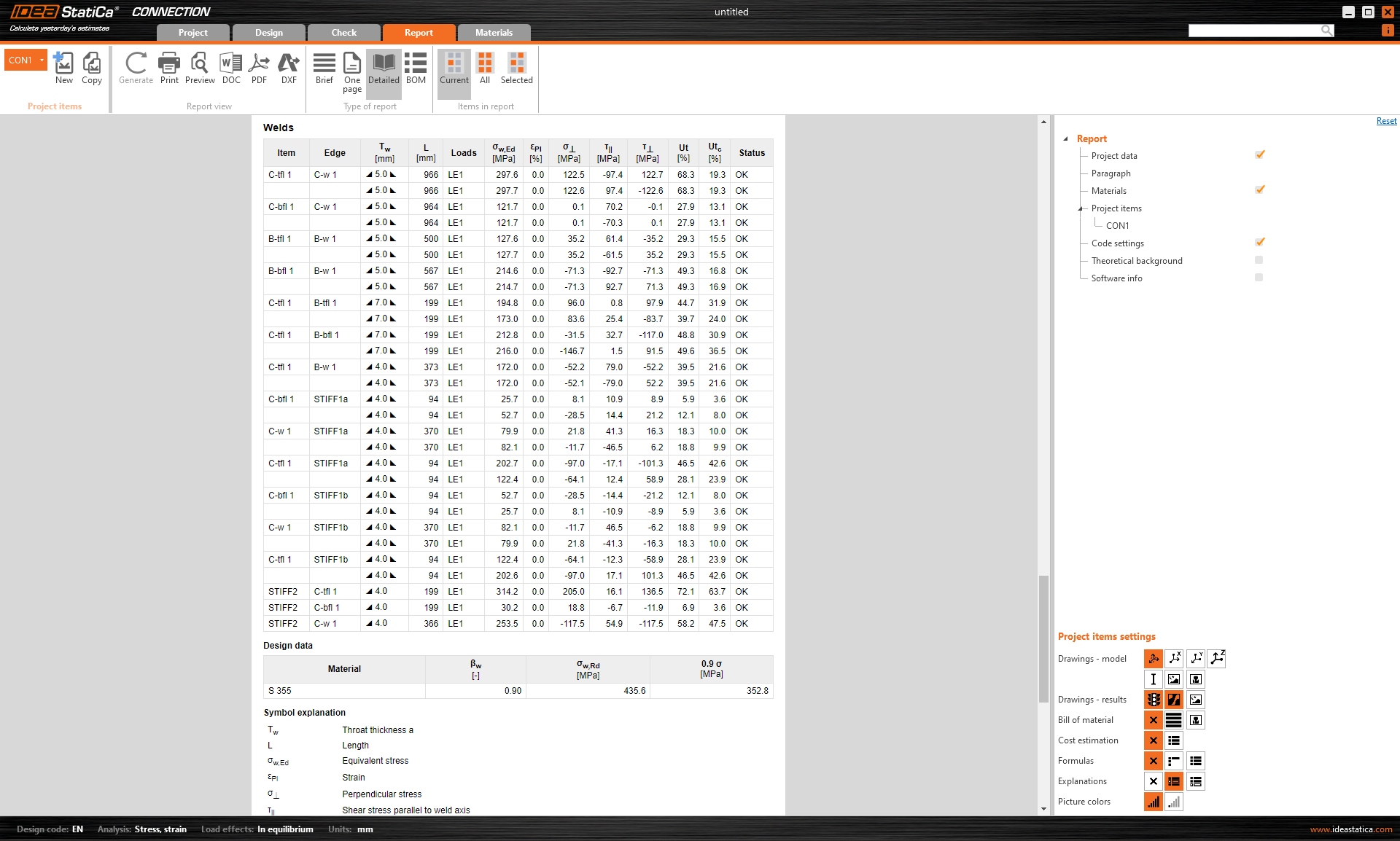 De lassen worden gecontroleerd, en de waarden van spanning, rek en controles op basis van de code worden gepresenteerd in de Resultaten: