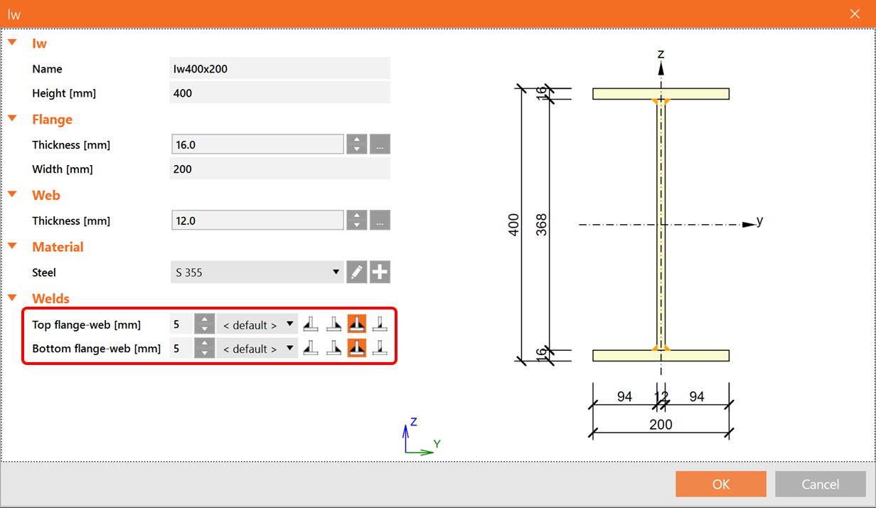 Deze functie is beschikbaar in IDEA StatiCa Connection, Member en Checkbot. In Connection wordt de volledige functionaliteit geboden. Voor projecten in Member kunnen de lassen van de gelaste doorsneden worden gedefinieerd, maar de codecontroles van de volledige lassen van het element zijn niet aanwezig. De gelaste doorsneden kunnen ook in Checkbot worden gedefinieerd.