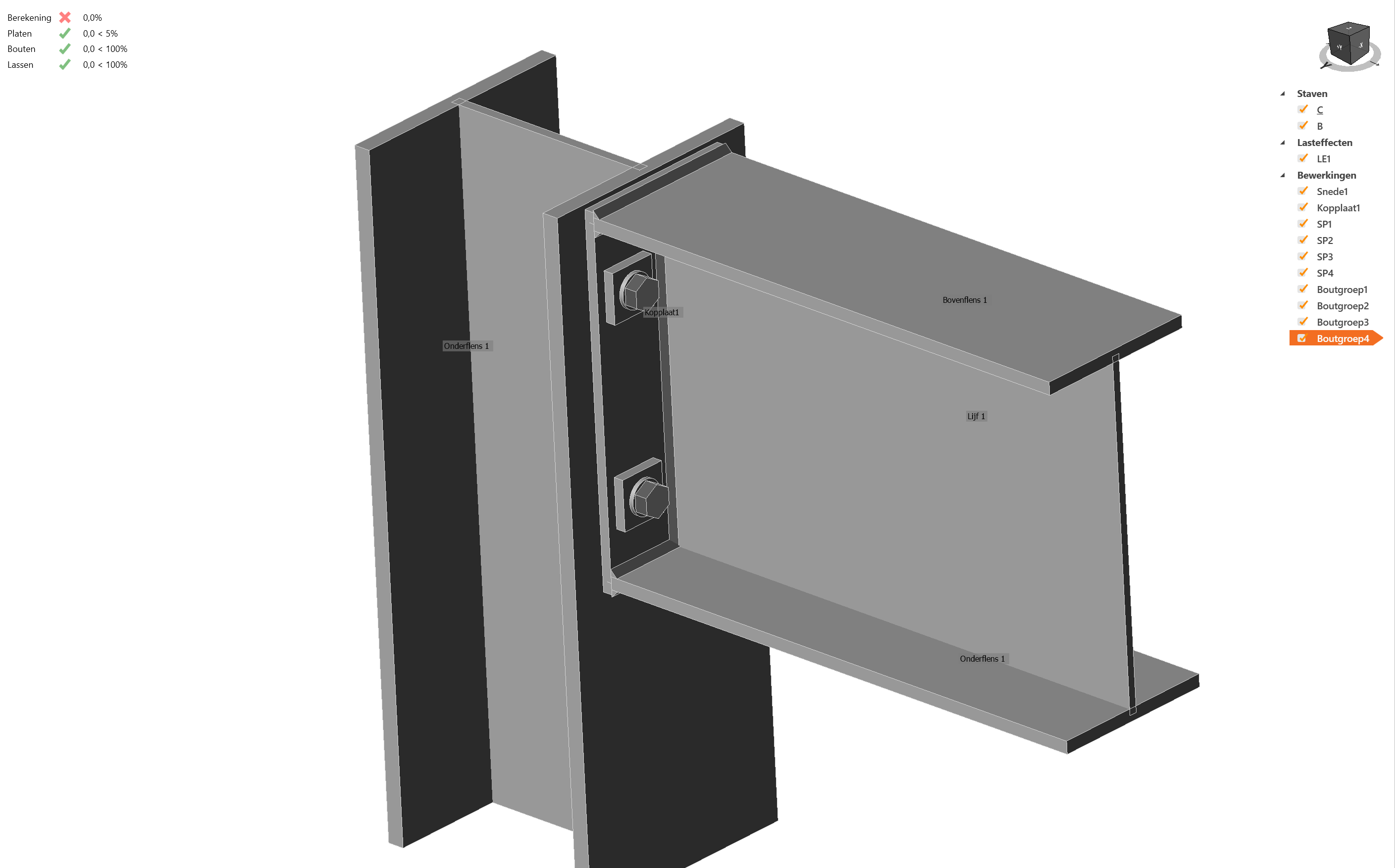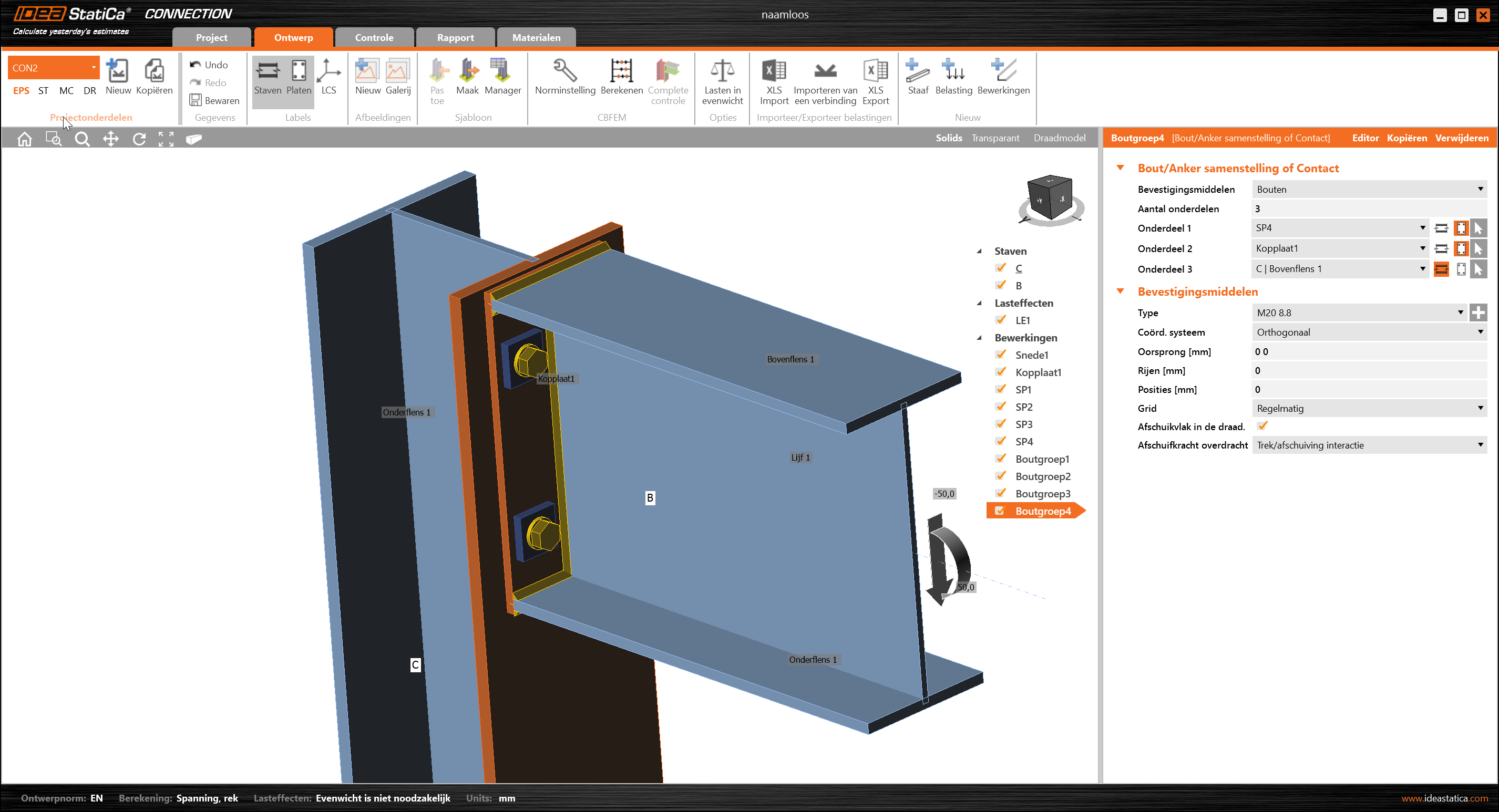 Deze plaatjes zullen in de praktijk nergens naartoe gaan, maar IDEA kan dit niet berekenen omdat de plaatjes rond kunnen draaien rond de bout en bij een las aan 1 zijde van het tussenplaatje om kunnen klappen.