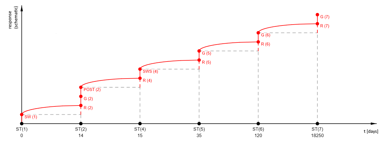 TDA (Time Dependent Analysis) wordt uitgevoerd met oplopende belastingen in alle bouwfasen. Alles kan worden weergegeven op het volgende eenvoudige schema van stadia (zichtbaar in het menu Bouwstadia (Construction stages) na omschakeling naar de Geschiedenis van belastingen (History of loads)).