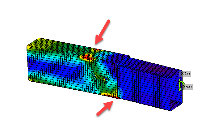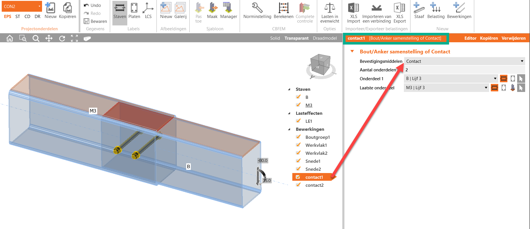 CON2 is gemodelleerd met contactvlakken. Het is nu zichtbaar dat de vlakken meedoen met de krachtsafdracht.