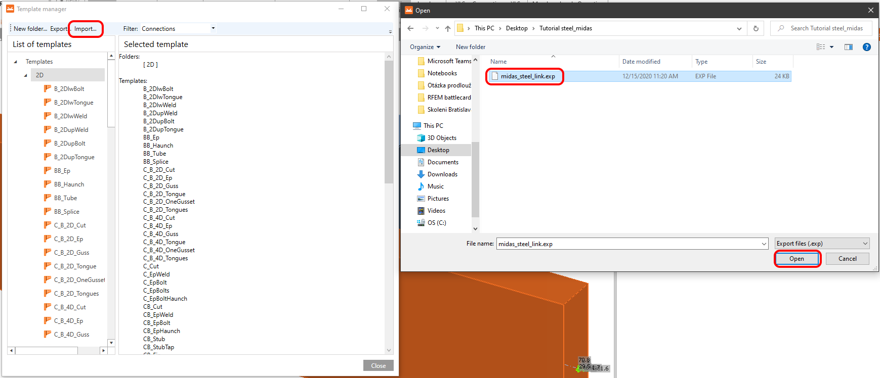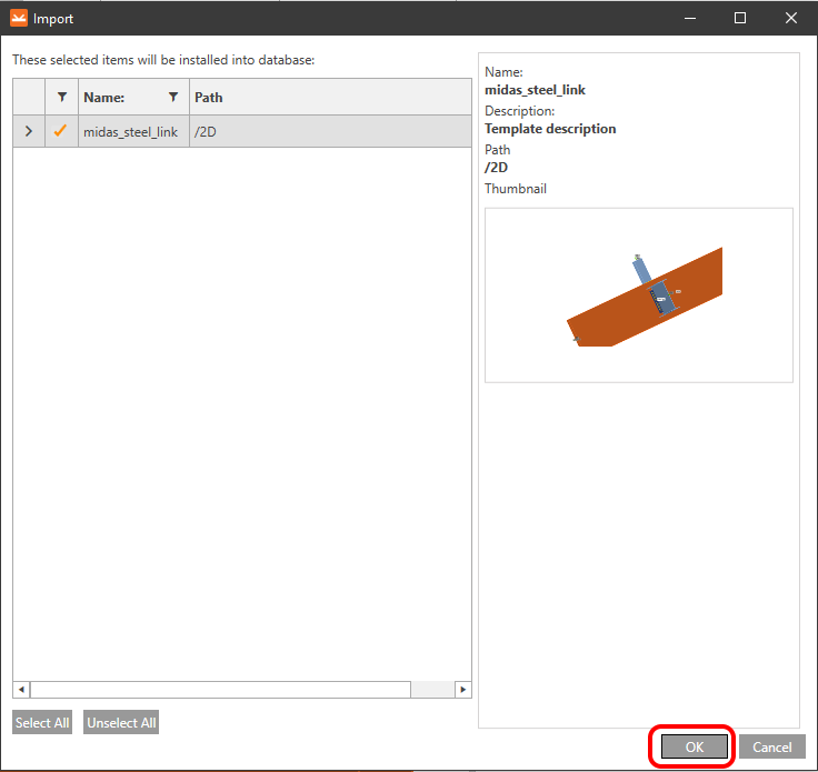 Import the predefined template file midas_steel_link.exp and save it to the local library.