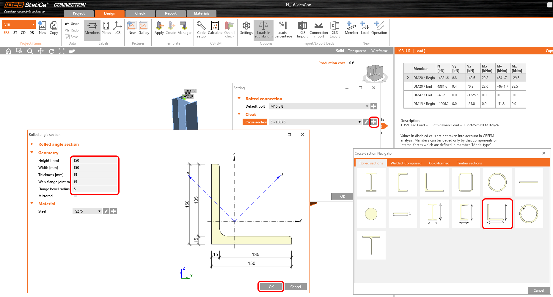 During uploading the template to your model will appear the dialog where is necessary to set the bolt grade and the profile of the cleat. Let the bolt grade as default and set the dimension of the Cleat.