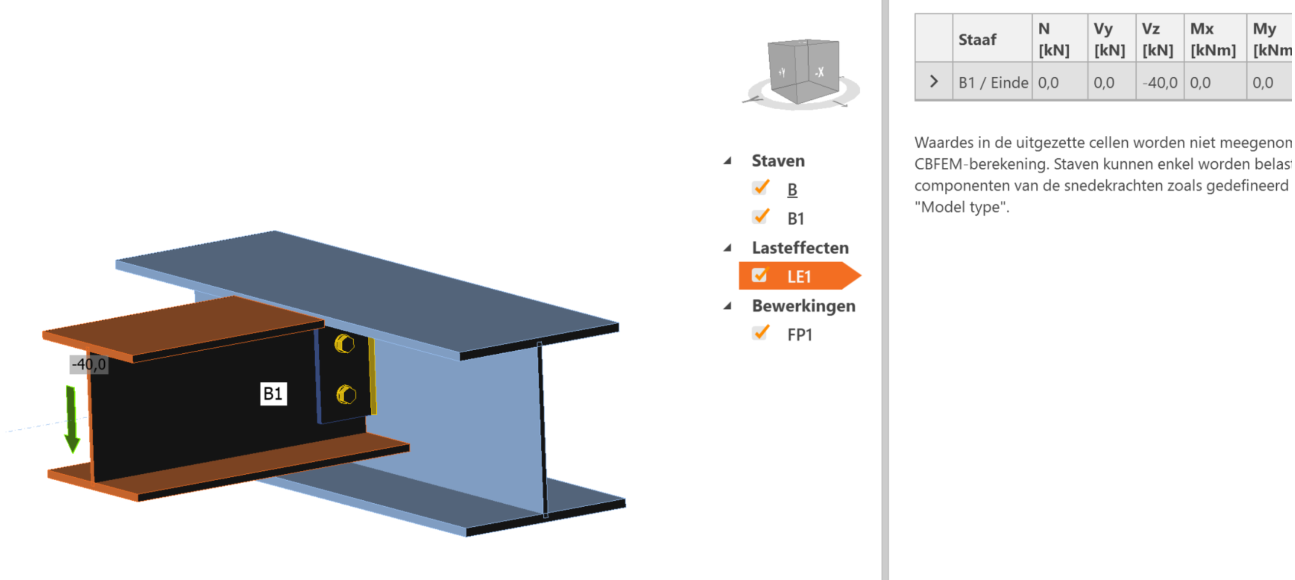 Hieronder ziet u een Draadmodelweergave van dezelfde verbinding met in de groene pijl de optredende dwarskracht van 40 kN.