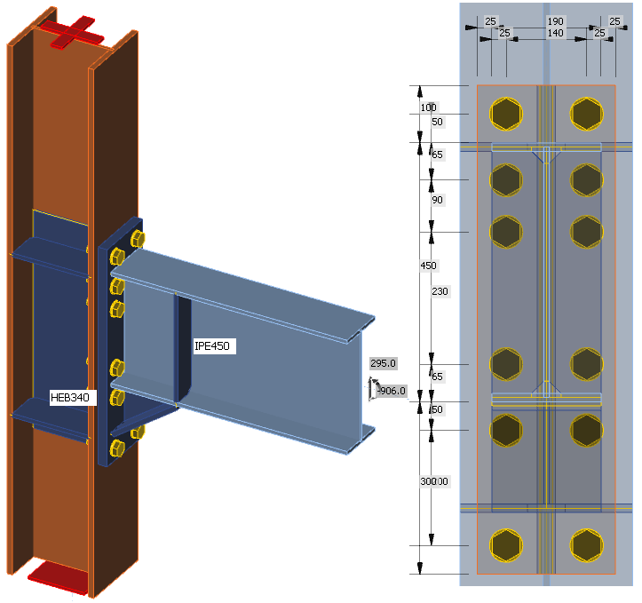 Ligger IPE 450 is verbonden met kolom HEB 340 via kopplaat met console. De console is minder dan 35° met een lijf- en flensdikte van respectievelijk 9,4 mm en 18 mm. De hoogte van de console is 178 mm en de lengte is 250 mm. De kolom wordt versterkt door verstijvers met een dikte van 15 mm en door lijfopdikplaten aan beide zijden van het kolomlijf met een dikte van elk 10 mm. De hoogte van de opdikplaten is gelijk aan de hoogte van de kopplaat. De kopplaat heeft een dikte van 35 mm.
