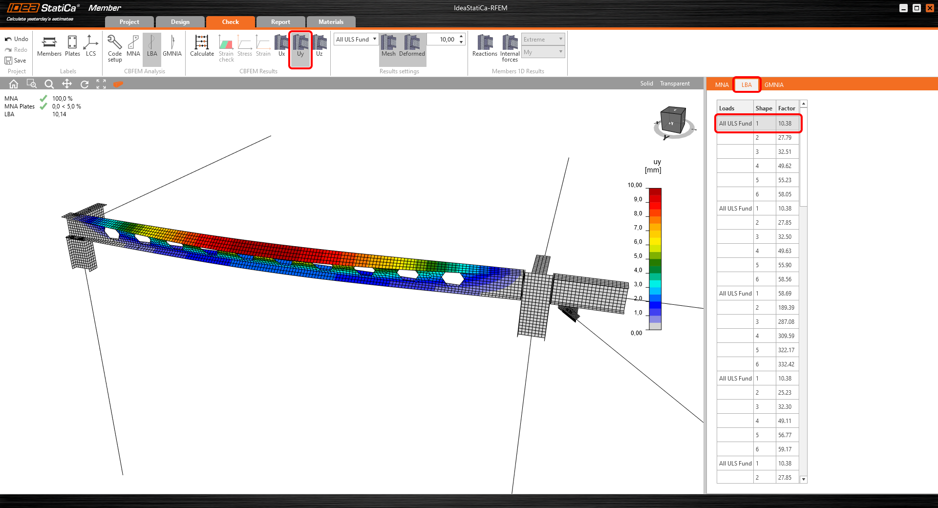 Schakel in de volgende stap het berekeningstype CBFEM om naar LBA (lineaire knikanalyse) en voer de analyse opnieuw uit door op Berekenen te klikken.