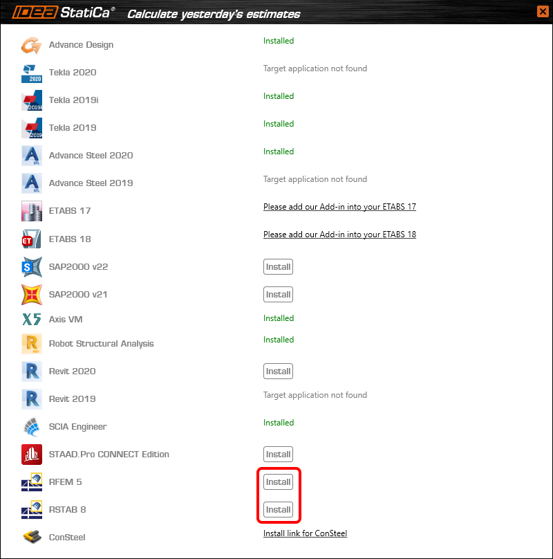 Selecteer de software om de IDEA StatiCa BIM-link te installeren, klik op de knop Installeren en controleer de status.