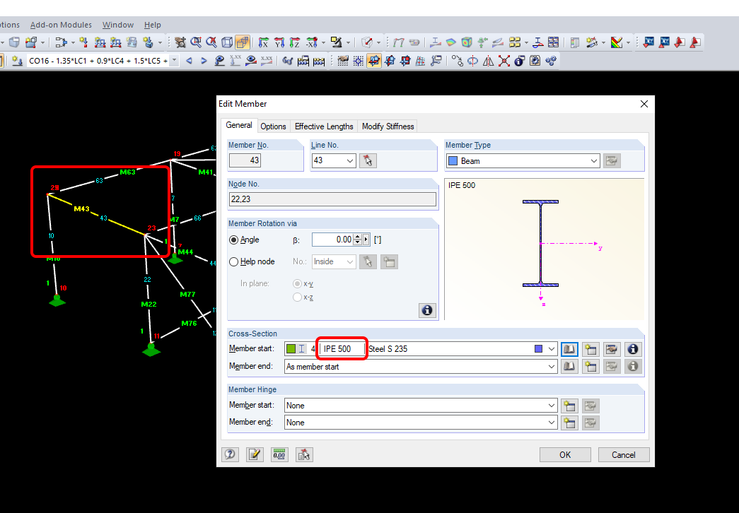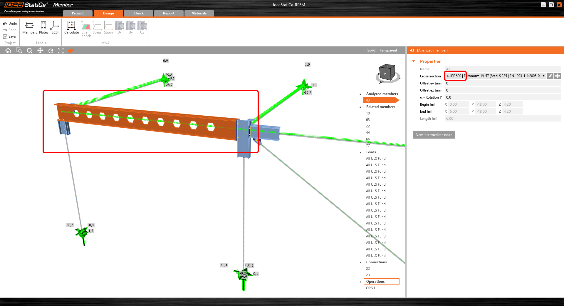 De staaf wordt samen met de bijbehorende verbindingen aan de lijst toegevoegd en door deze te selecteren wordt het draadmodel samen met het tabblad met doorsneden weergegeven. In deze stap kunt u de geïmporteerde belastinggevallen beheren. We laten de standaardinstellingen staan en beginnen eerst met het configureren van de verbindingen.