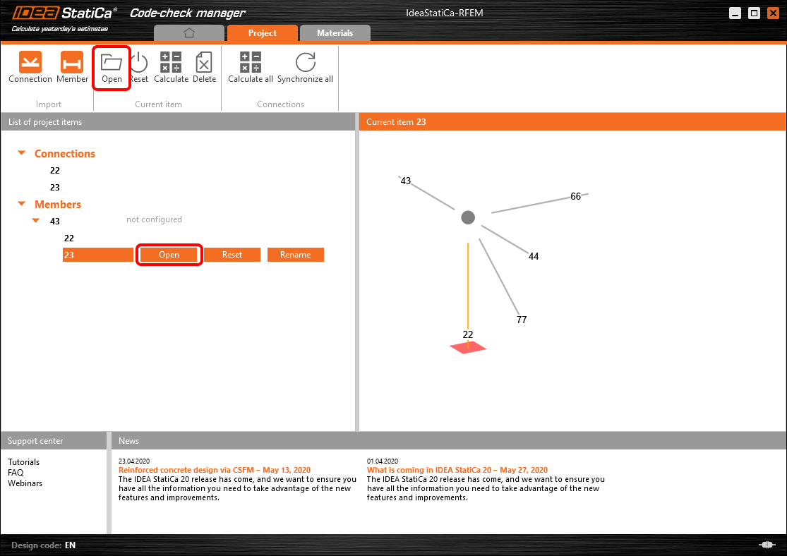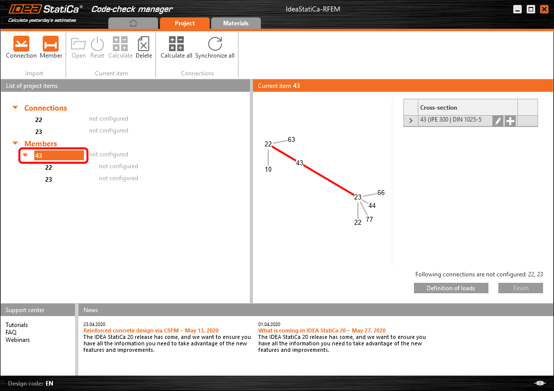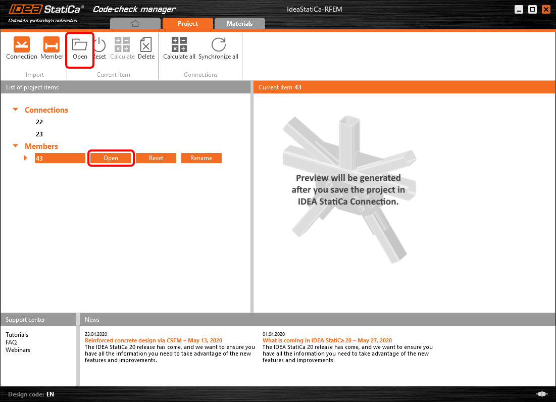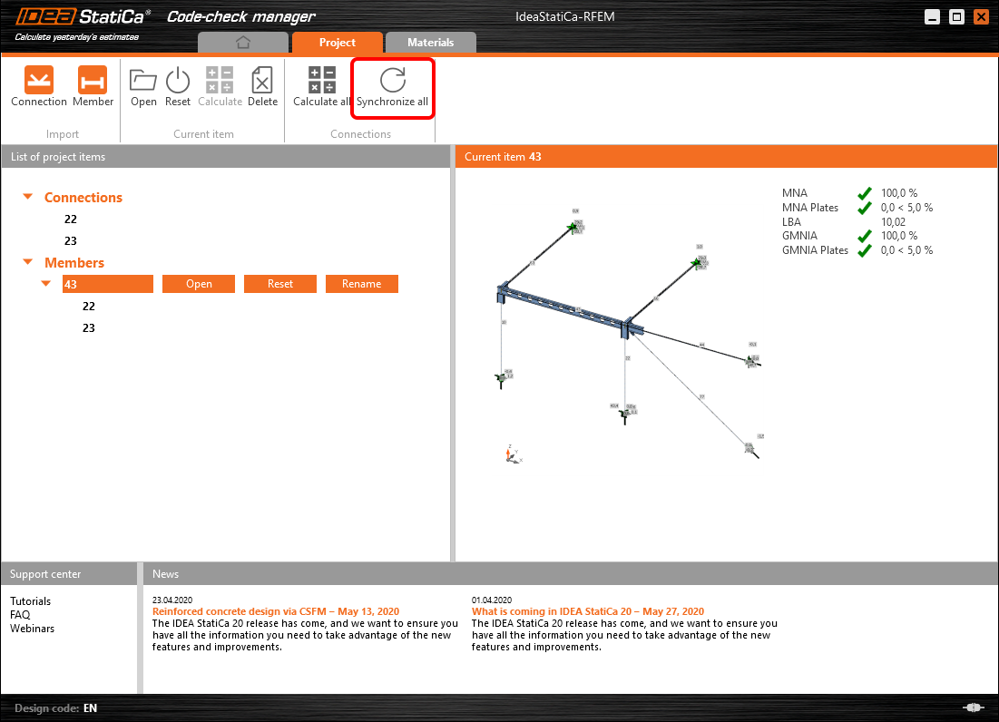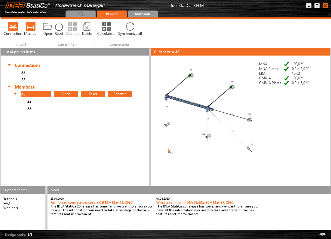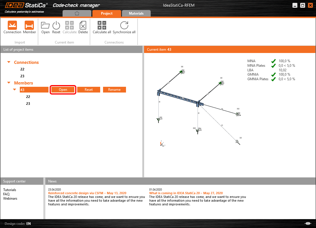 Sla het project op in IDEA StatiCa Member en sluit het. Alle constructieve details die van het RFEM/RSTAB-project naar IDEA StatiCa worden geïmporteerd, blijven op de lijst staan. De Code-check manager provides useful commands voor de verdere verwerking van de geïmporteerde items.