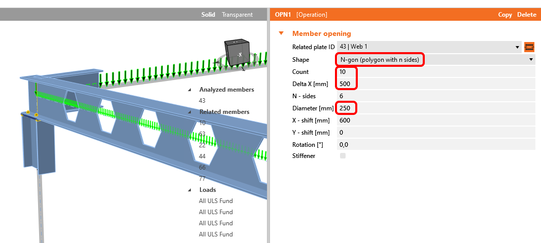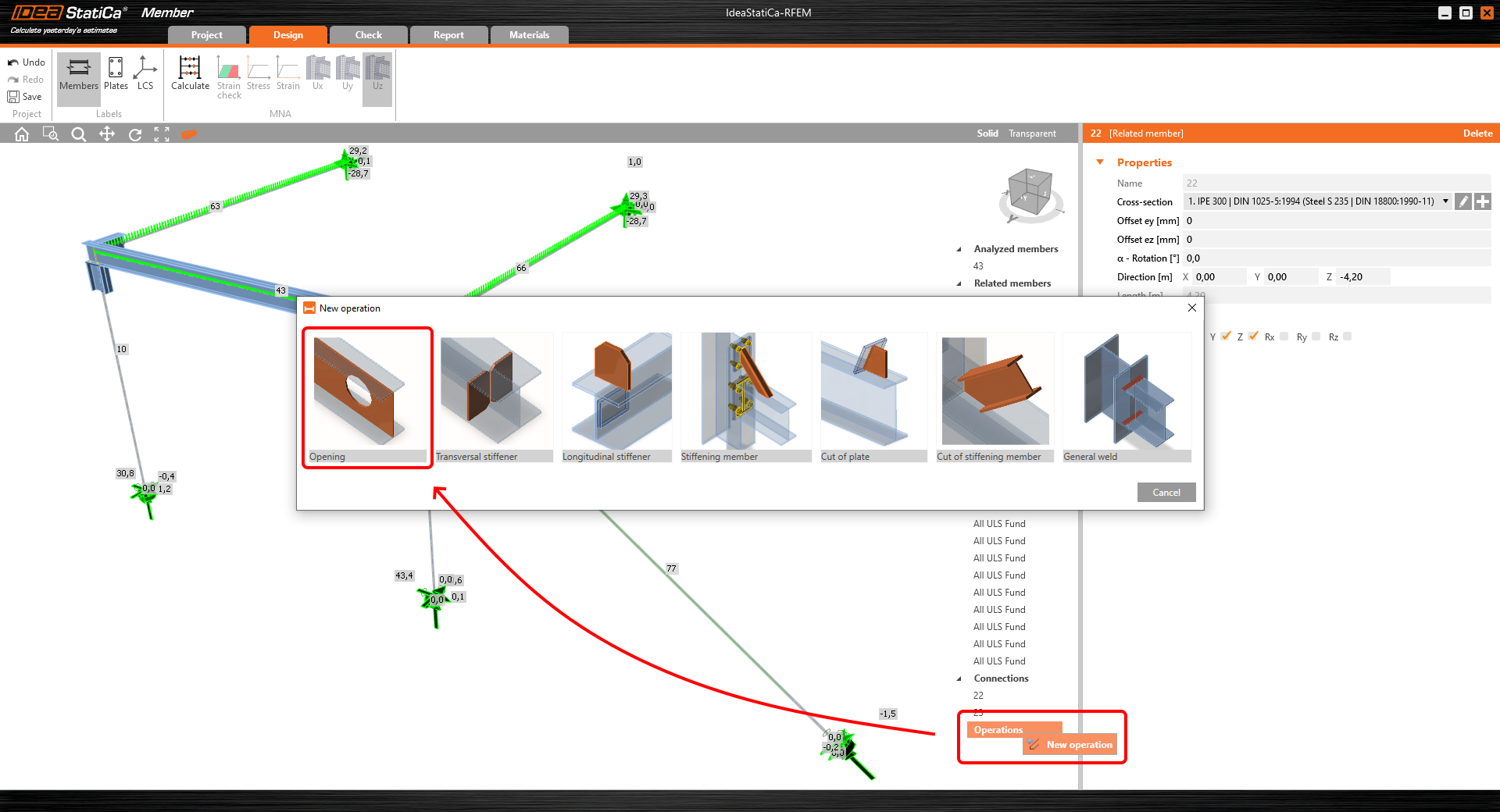 Alle gegevens zoals geometrie en belastingen zijn geïmporteerd en alle verbindingen zijn al ontworpen. Het model is klaar om berekend te worden, maar laten we eerst wat openingen toevoegen aan het lijf van de staaf. Klik met de rechtermuisknop op Bewerkingen in het boommenu en kies de bewerking Opening.