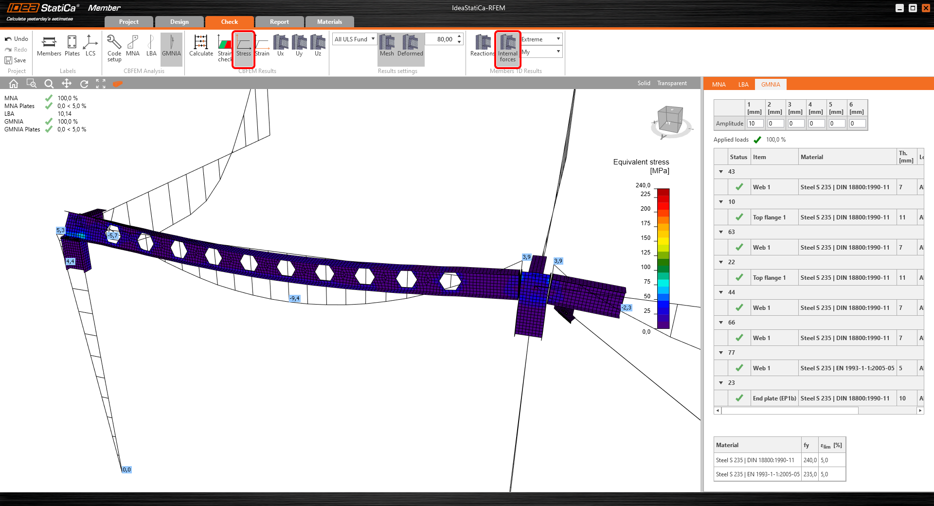 Nu kunt u de GMNIA (geometrisch en materieel niet-lineaire analyse met imperfecties) berekenen. Kies volgens EN 1993-1-1 de meest kritische knikvorm of een combinatie van knikvormen en voer de initiële imperfectie van de kritische balk in. In dit geval is de knikvorm 1 de meest kritische. Schakel over naar het GMNIA-tabblad in het rechterpaneel en determine the imperfection van 10 mm (0,5xL/300 = 0,5*6000/300 = 10 mm) om in te typen als de Amplitude in kolom 1. Klik op de knop Berekenen voor deze analyse kan de berekening enkele minuten duren.
