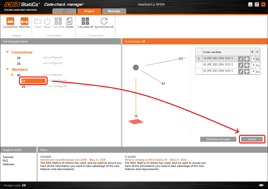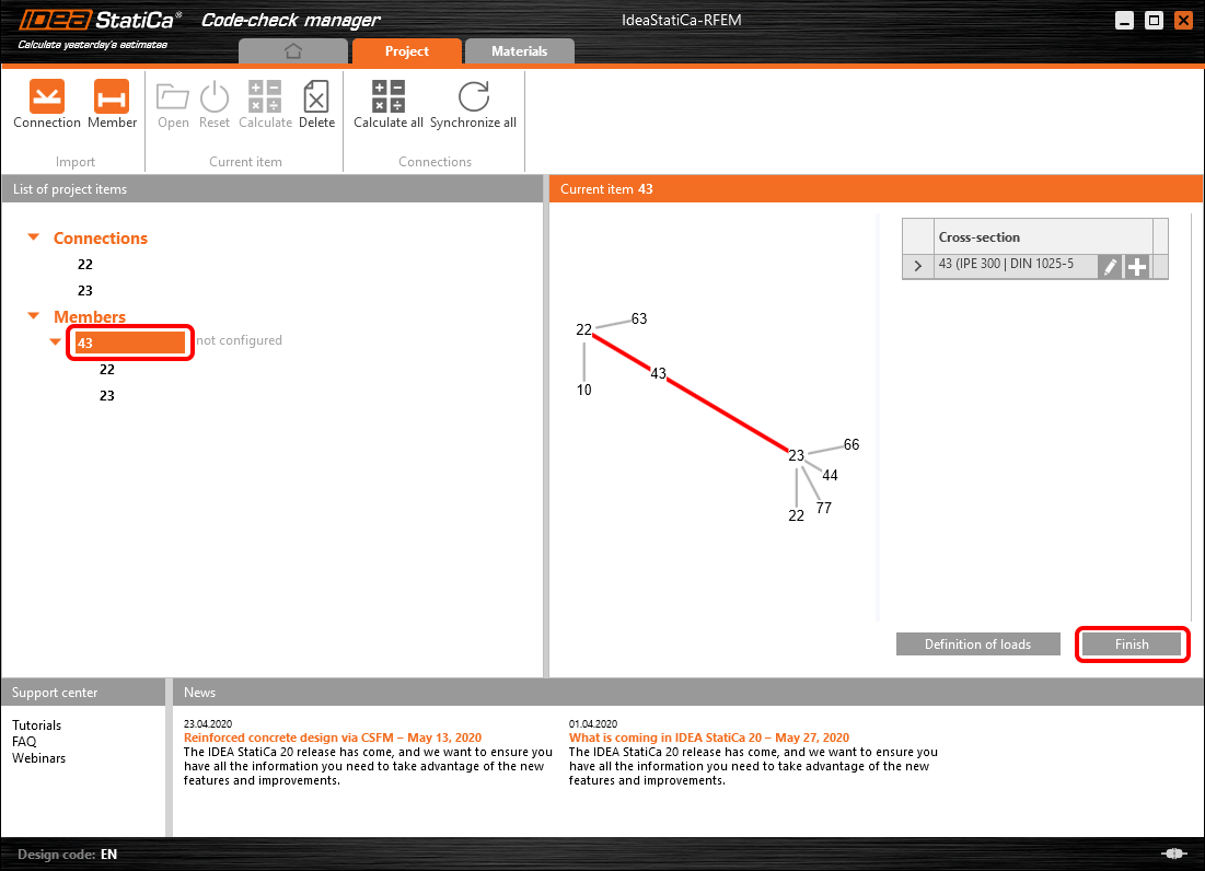 Selecteer node 22 in de lijst, klik op Voltooien en open het in de Connection module om de verbindingen te configureren door de tutorial BIM link tutorial Connection - RFEM/RSTAB (EN) vanaf hoofdstuk 3 te volgen.