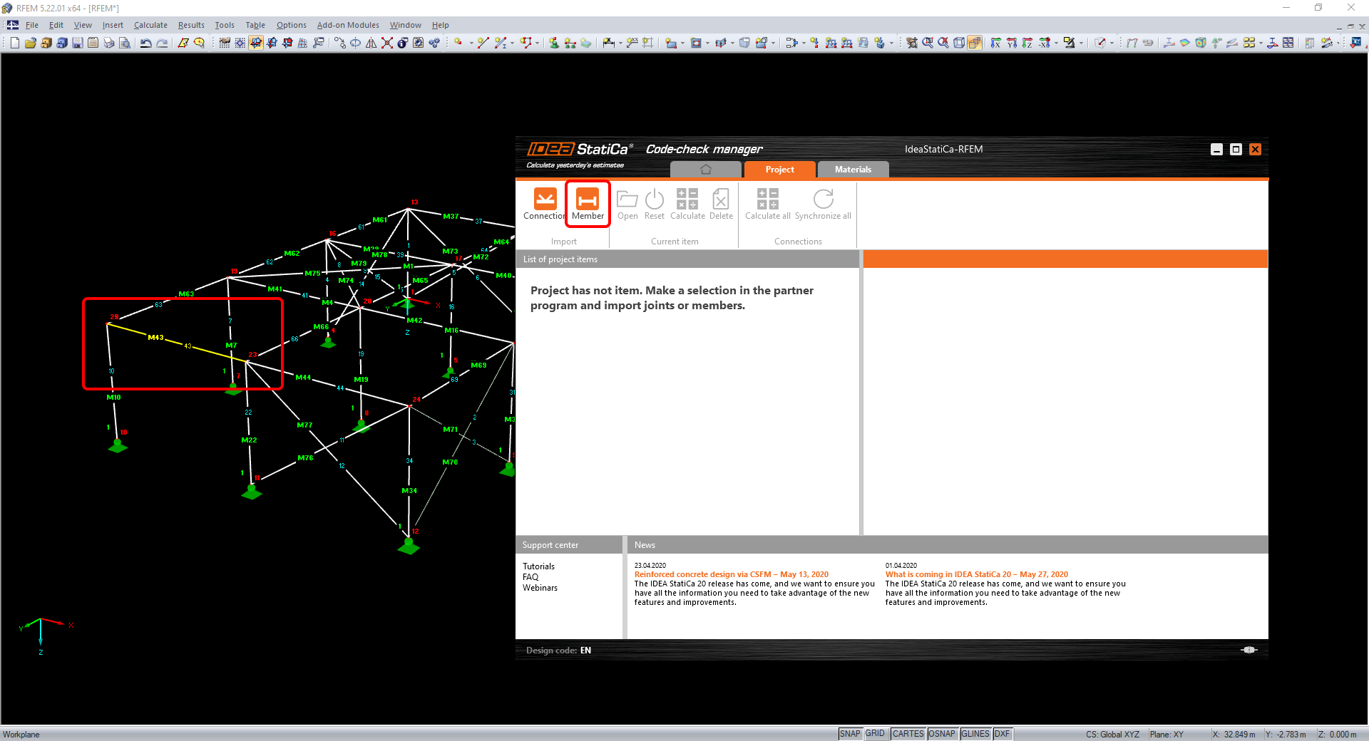 De Code-check manager wordt geopend en u kunt het importproces starten. Selecteer een ligger of kolom in het RFEM/RSTAB-model en klik op Member om deze te importeren voor de berekening in IDEA StatiCa Member onder de eurocode.