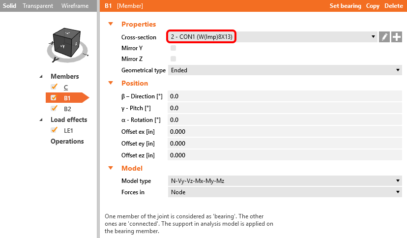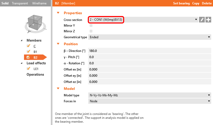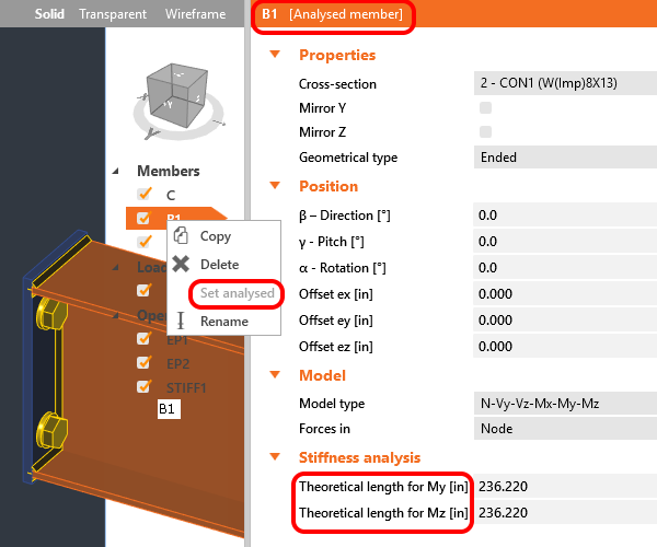 Verify that beam B1 is set as an Analysed member as shown below. (If you want switch Analysed member, you can use right mouse button and set another member as an Analysed member).