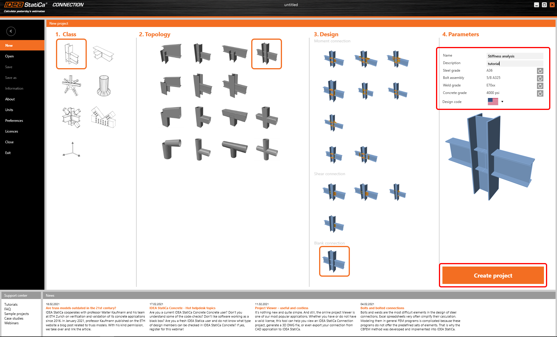 Start with launching the IDEA StatiCa Connection. Create a new project by selecting a starting template closest to the desired design, fill the name and choose AISC design code and default steel grade – A36.