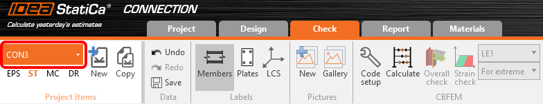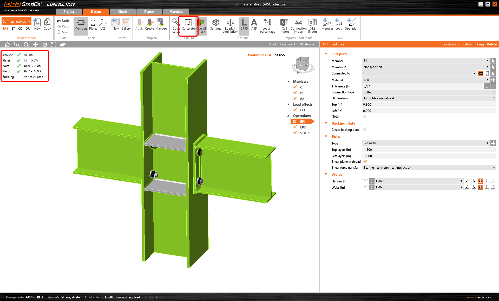 Select Calculate in the ribbon to run the analysis based on the CBFEM method. The numerical model is automatically generated, the calculation is performed and you can directly see the overall check results in the top-left corner of the scene.