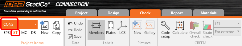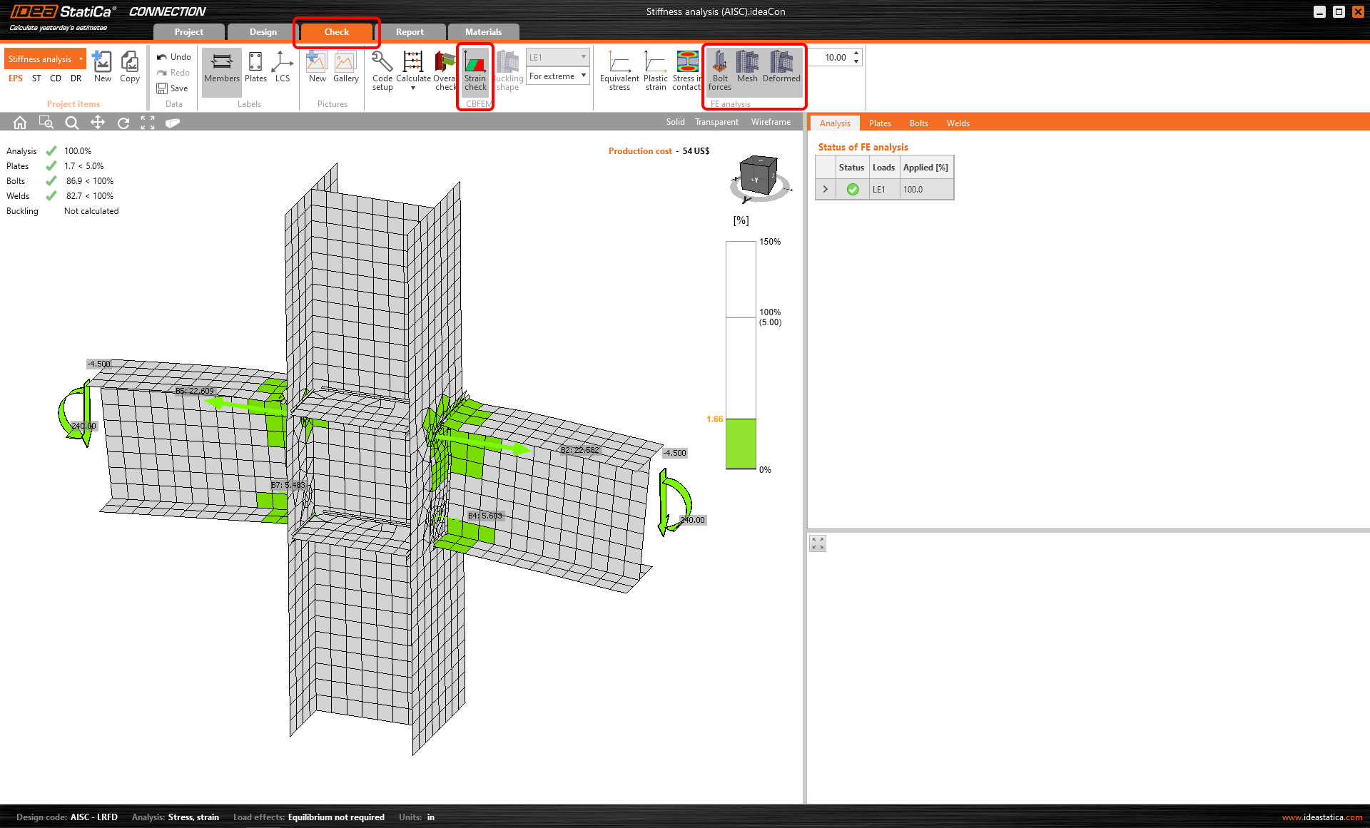 More detailed results can be displayed in the Check tab: activate the Strain check, Bolt forces, Mesh and Deformed shape of the connection in the ribbon to get a full picture of what is happening in the joint.