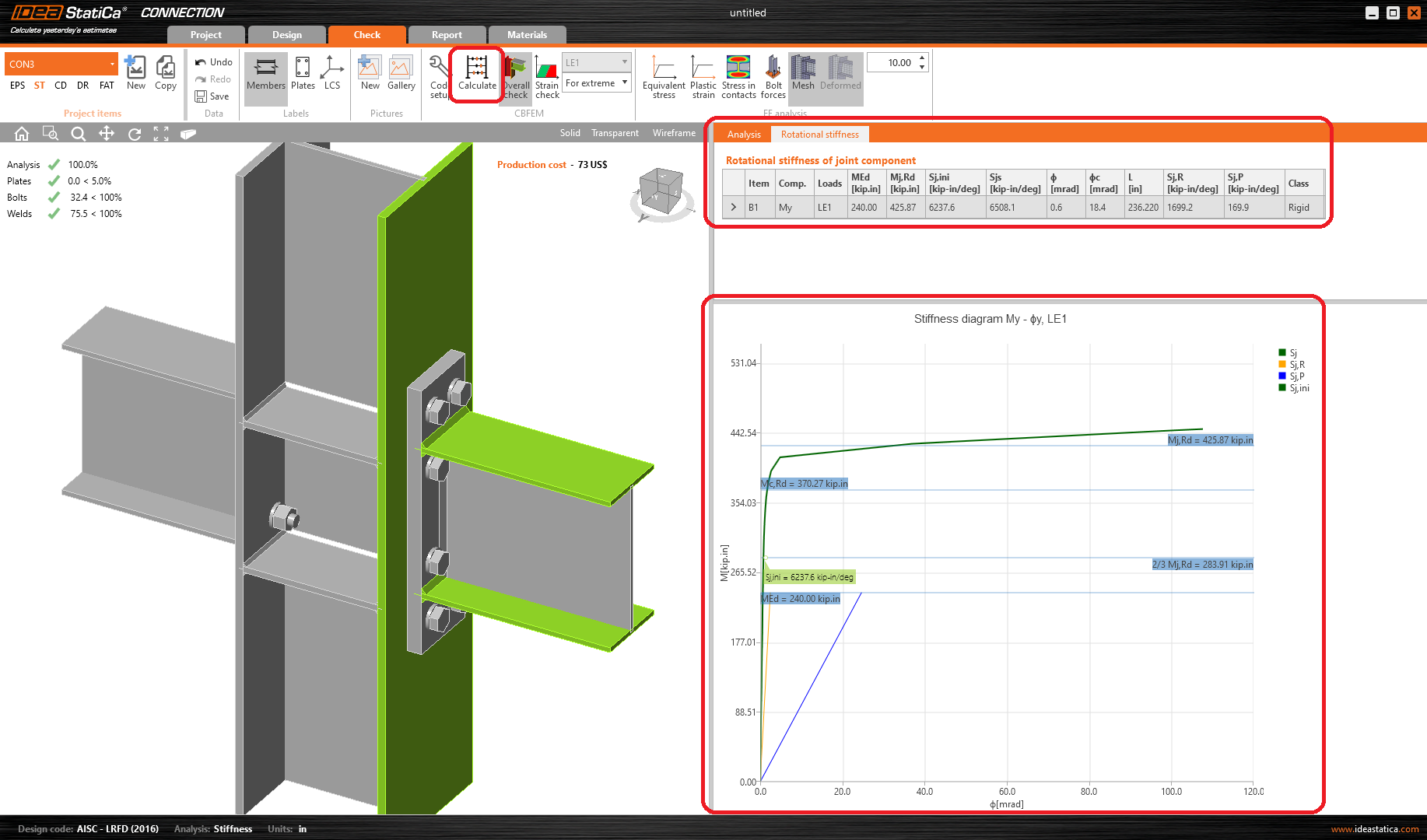 Now run stiffness analysis again by icon Calculate from the top ribbon. And you can notice the change in results from Semi-rigid to Rigid.