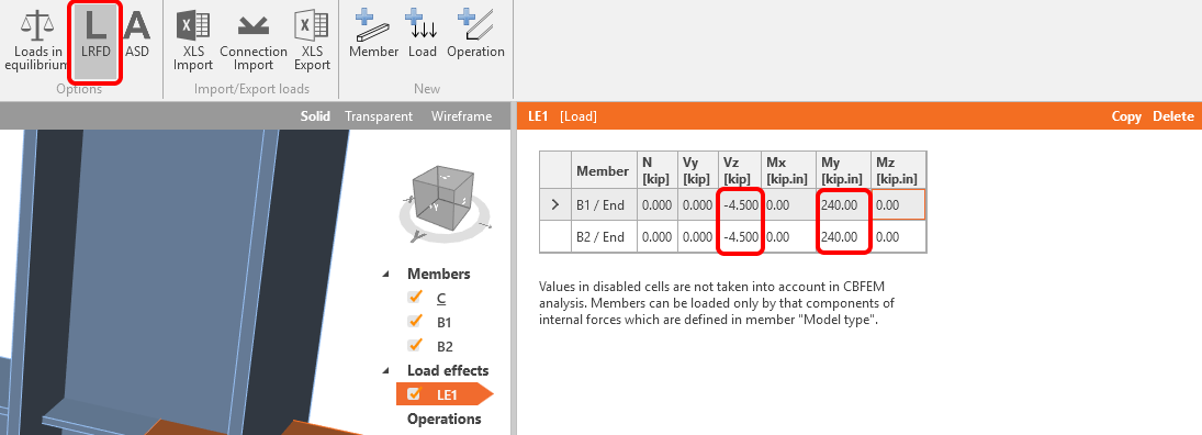 You can continue with Load effects. You input values of forces into the table and set the AISC-LRFD design code. More load cases can be added.