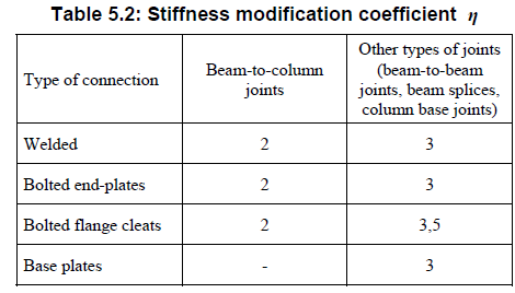 IDEA StatiCa shows the joint behavior as if it was brand new and loaded just one time with a particular load case. But there are a lot of uncertainties. The joint may have undergone some plastic deformations in the past, it may be rusty and workers may have used some nasty methods to assembly the joint together and get rid of manufacturing tolerances. For semi-rigid joints, the initial stiffness is used in global analysis only if Mj,Ed never exceeds 2/3 Mj,Rd in the whole life-time of the structure. That rarely happens but it can be the first step to determine the Mj,Ed. If the design bending moment exceeds 2/3 Mj,Rd in any load case, the initial stiffness reduced by factor \(\eta\) from Table 5.2 should be used in global analysis:
