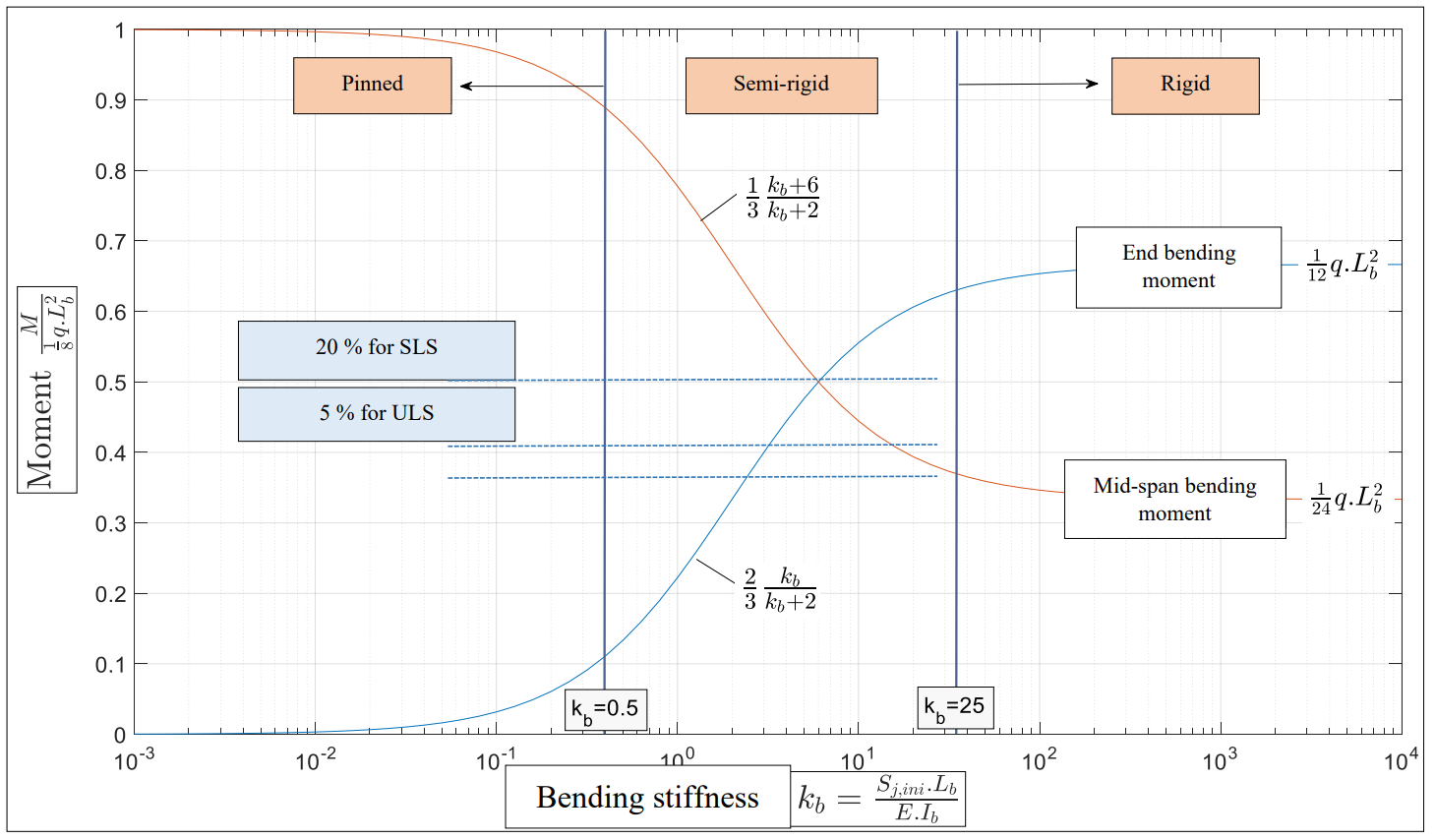 This possible error is displayed in the following picture with the example of a beam connected to a column on both ends. The blue curve shows the bending moment at the joints and the red curve bending moment in beam mid-span. The internal forces nearly do not change in pinned and rigid region but change rapidly in the semi-rigid region. Also notice the logarithmic scale for bending stiffness. It means that the stiffness may change even 100 times and it will have very small effect if the joint stays in rigid or pinned region.