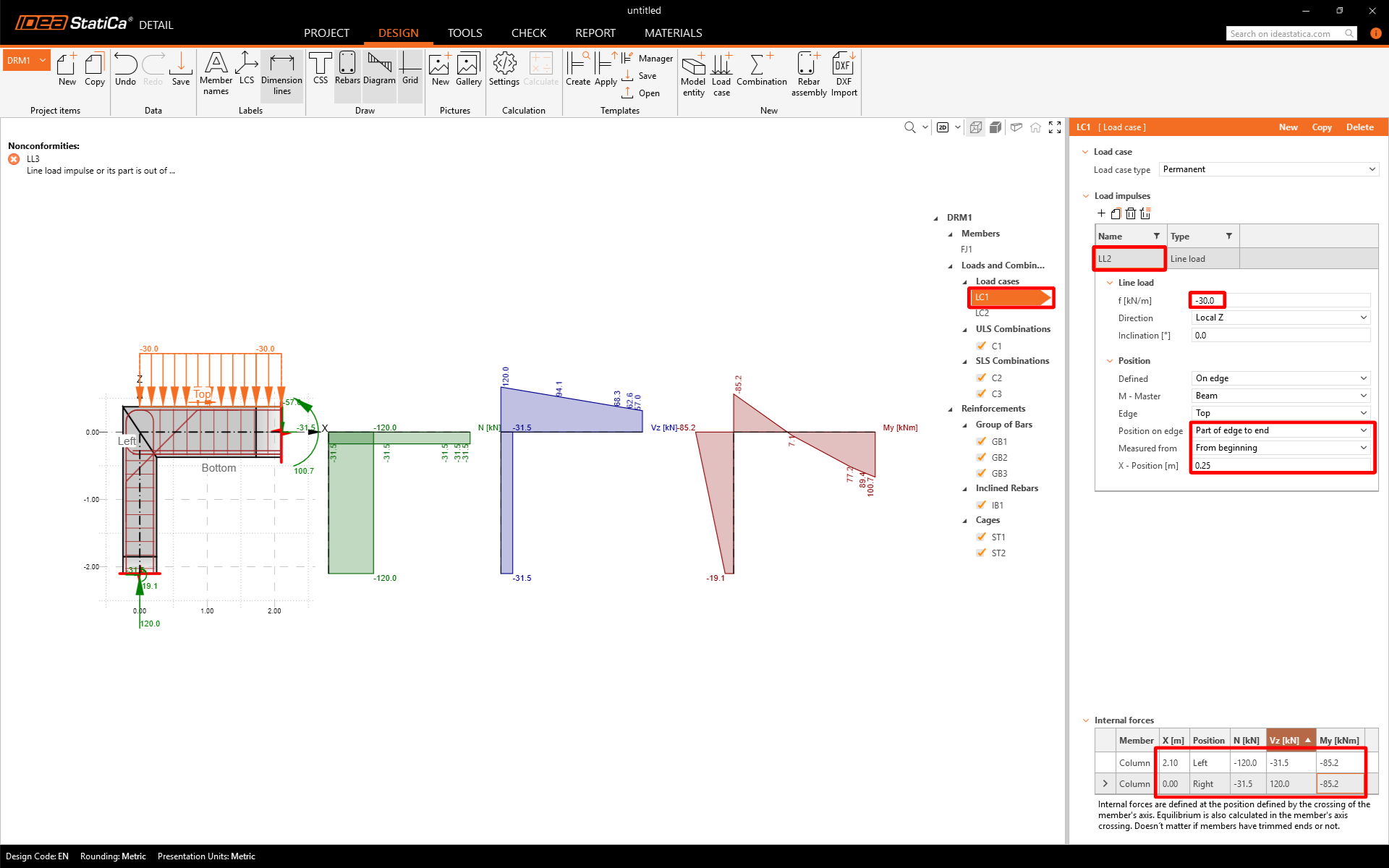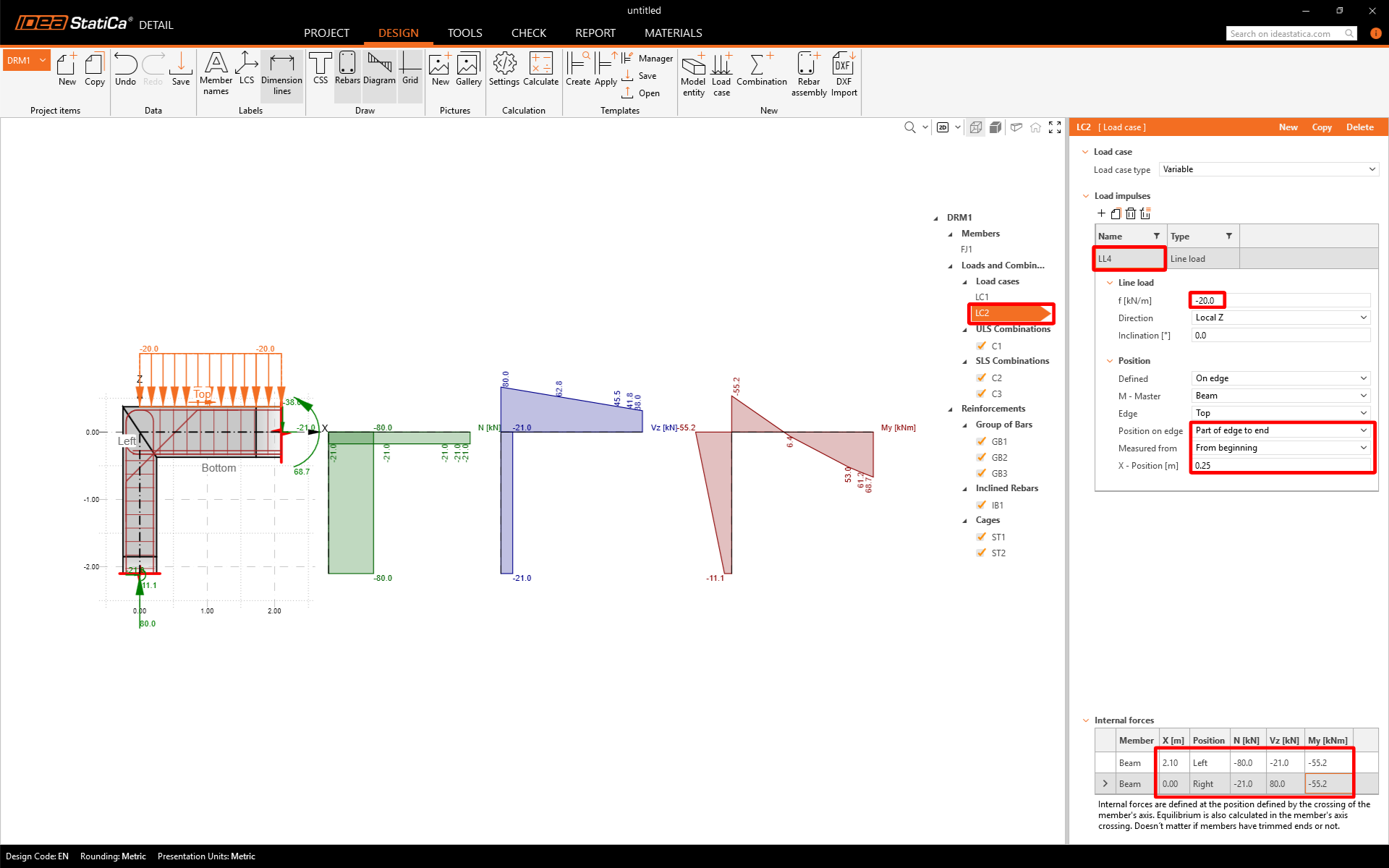 Now go to the Internal forces tab and apply them in the cross-section, which is placed in the intersection of the column and the beam. You can get these internal forces by modeling and calculating the whole frame with the corresponding line load (30 kN/m for LC1 and 20 kN/m for LC2) in any CAE/FEM software in minutes.