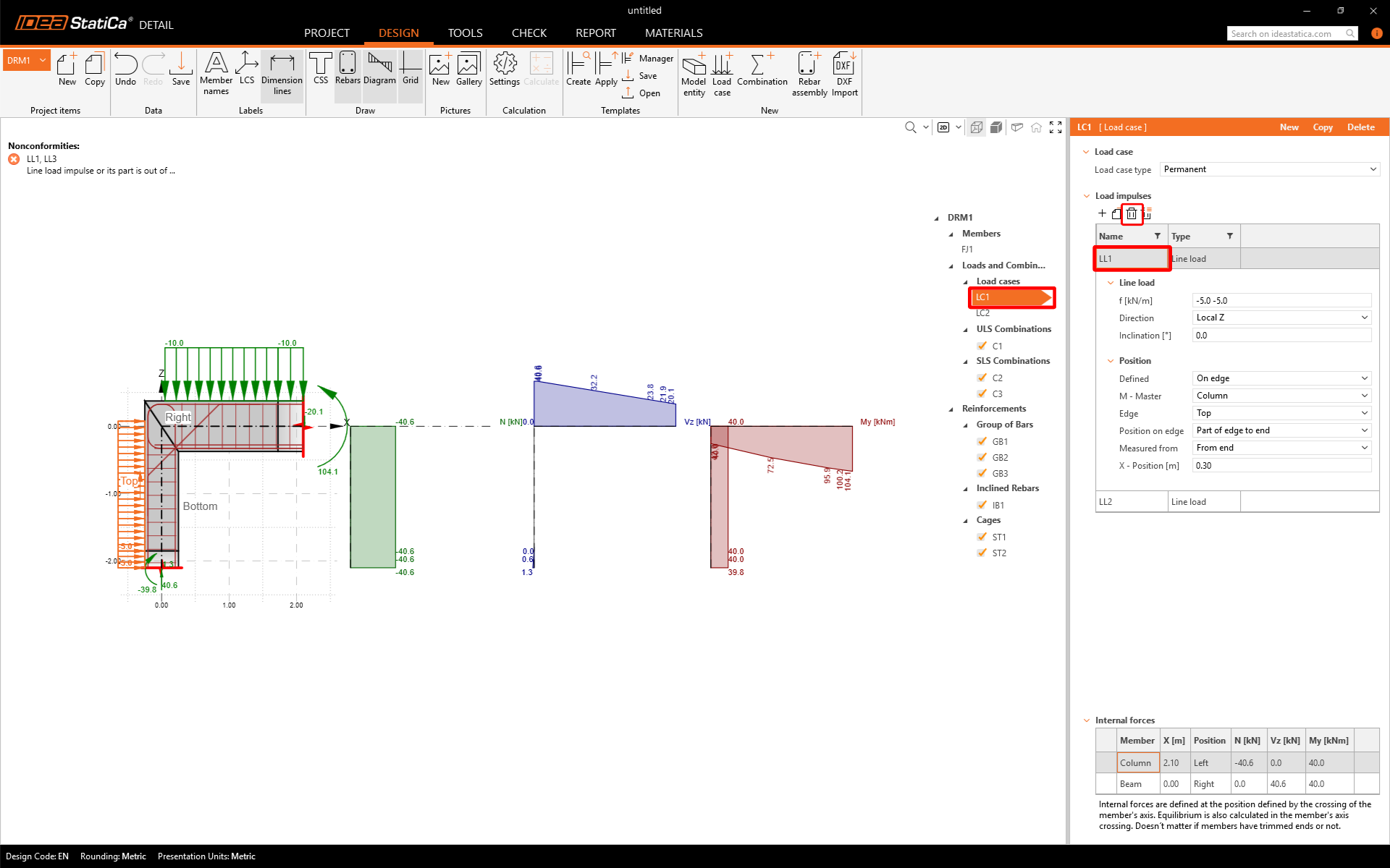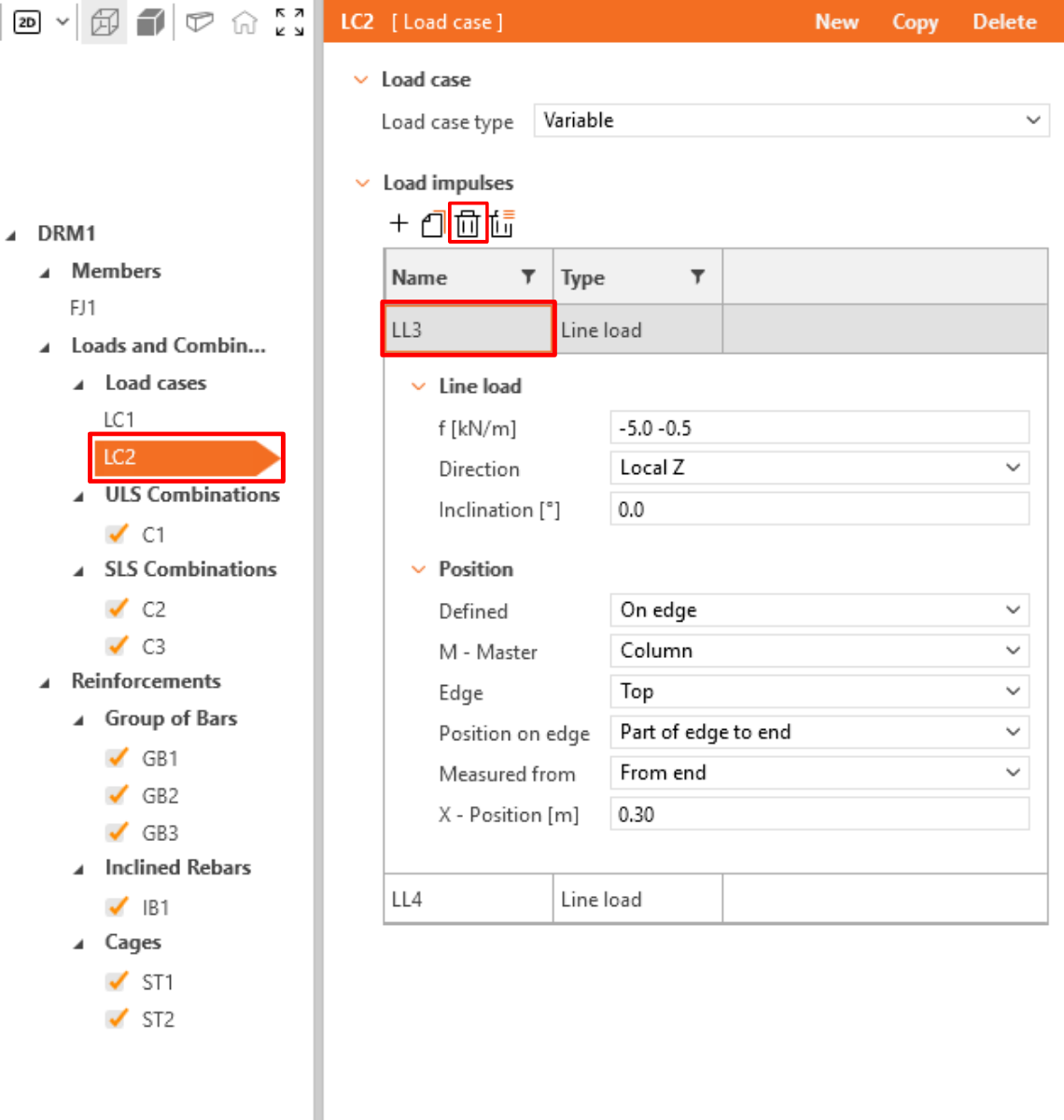 Let's modify load case LC1 for permanent effects. First, remove the line load from the column.