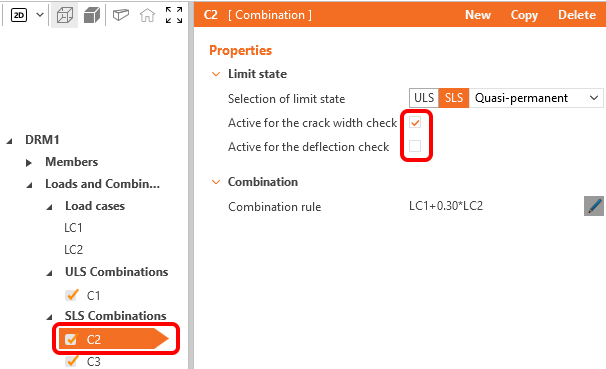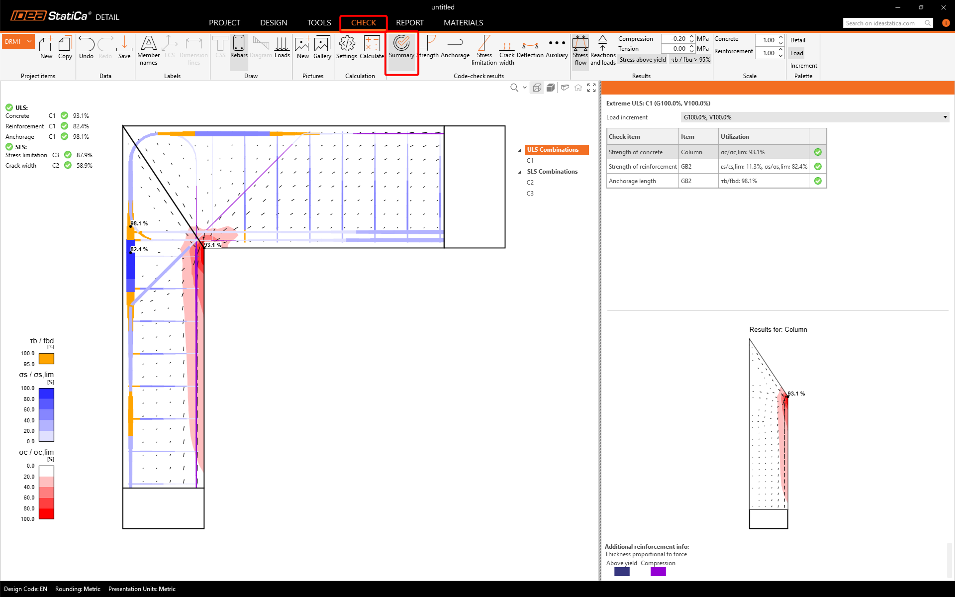 In the first row of the table, you can see that the governing ULS check is the strength of the reinforcement in the combination C1.