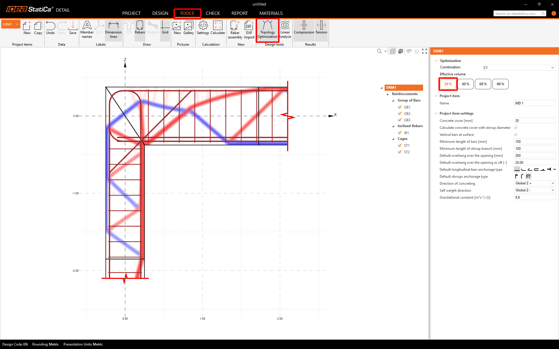 Once the load has been defined, you can proceed to reinforcement design. Before you design one, you can try to run the Topology Optimization tool to see how the most effective reinforcement layout should look like if you want to use selected effective volume of the structure.