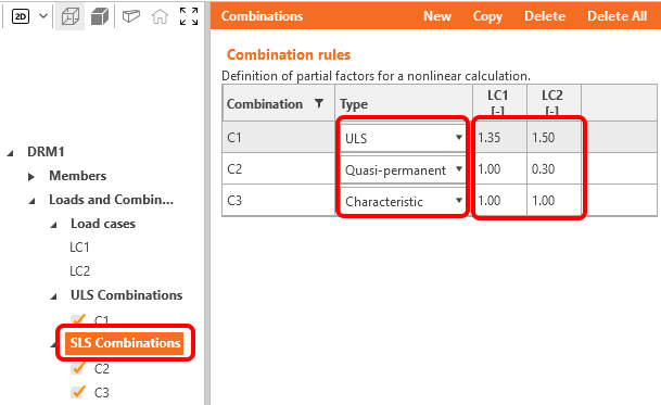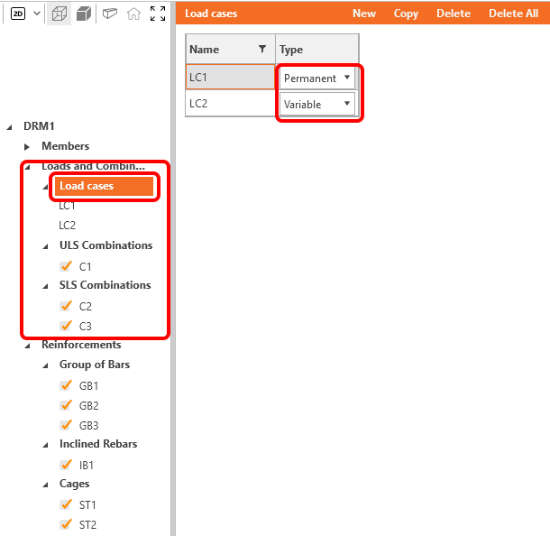In the navigator proceed to the definition of loads. Two load cases and three nonlinear combinations were automatically added by the software. You need two load cases to distinguish between permanent and variable loads and three combinations to cover ULS and SLS checks.