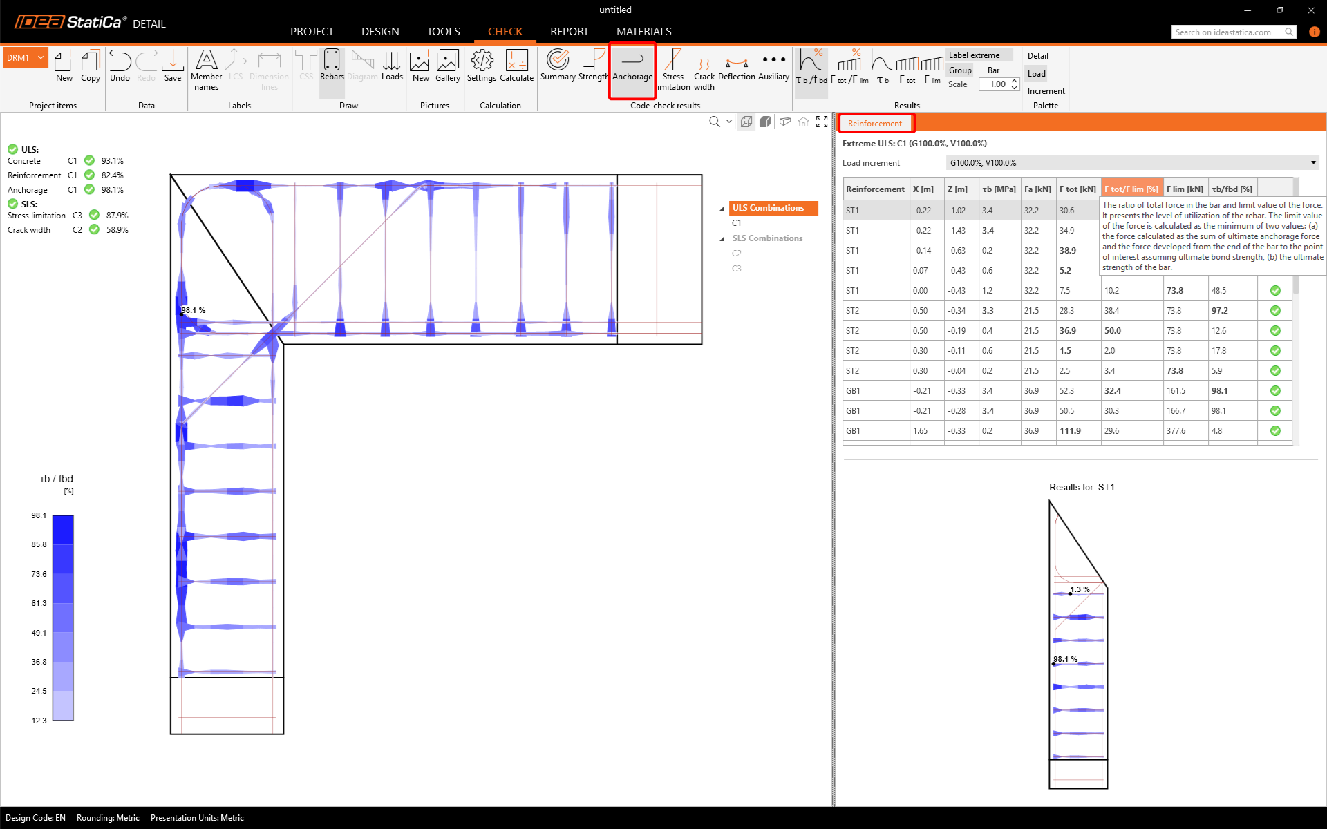 By changing the top tabs, you can display all the code checks. In the Summary, the main results for ULS/SLS are presented. Click on the line in ULS/Anchorage length to display the utilization of the bond between concrete and reinforcement (with the most critical spot marked in the figure).