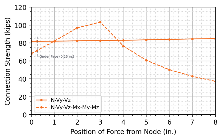 For model type N-Vy-Vz-Mx-My-Mz, both connection configurations presented increasing design strength with increases in the position of applied force from the node up to 3 in., after which the design strength sharply decreased with increasing distance from the node. For the all-bolted double angle connection, the 5% plastic strain limit controlled for positions of applied force up to 3 in. from the node, after which plastic strain in the double angle cleat controlled the design strength. For the bolted/welded shear end plate, the 3.0 buckling ratio limit controlled for positions of applied force up to 3 in. from the node, after which the strength of the welds controlled the design strength. As the position of force from the node increases, the moment at the critical section for flexural local web buckling decreases allowing more load. However, at the same time, the moment at the connection increases with the demands on the connection eventually controlling.