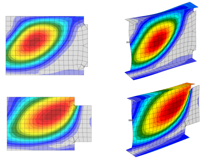 For both the traditional calculations and IDEA StatiCa, the connection strength is relatively constant for lower values of cope length, then decreases with additional cope length. For the traditional calculations, connections with cope lengths of 14 in. or less were governed by block shear rupture of the beam web, and flexural local web buckling of the coped beam web governed connections with cope lengths greater than 14 in. For IDEA StatiCa, connections with cope lengths of 10 in. or less were governed by the 5% plastic strain limit of the beam web, and connections with cope lengths greater than 10 in. were governed by a buckling ratio limit of 3.0. The buckled shape for the connection with a 12 in. cope length is presented in Figure 3; the shape is consistent with flexural local web buckling.