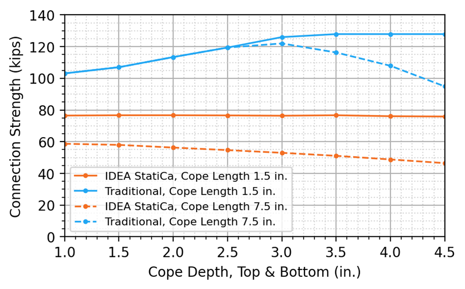 The strength from IDEA StatiCa is slightly greater than from the traditional calculations for the connections with cope lengths of 3 and 3-1/2 in. The web base metal strength check controlled the traditional calculations for these connections. IDEA StatiCa captures this limit state with the 5% plastic strain limit, so minor differences are expected. However, for all cases where the limit state of flexural local web buckling controls, the strength from IDEA StatiCa is less than that from the traditional calculations. As observed in the previous section, this is primarily due to the conservative nature of the 3.0 buckling ratio limit.